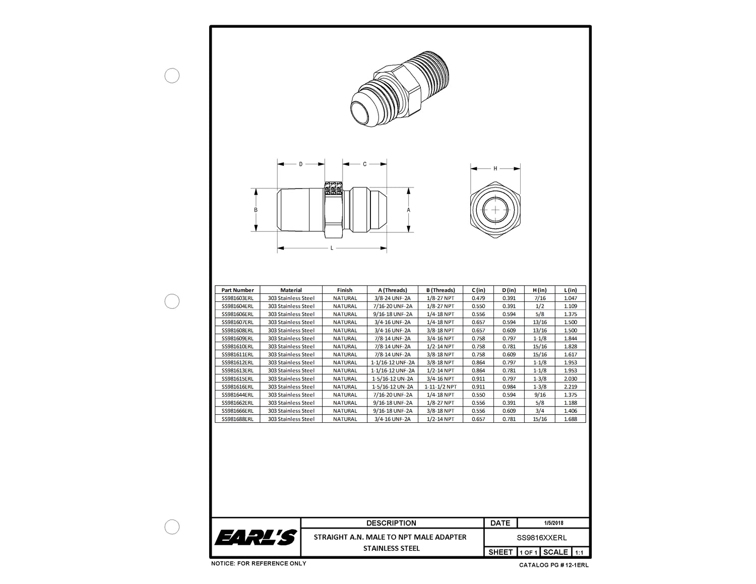 Earl's Performance SS981613ERL - Straight Stainless Steel AN to NPT Adapter
