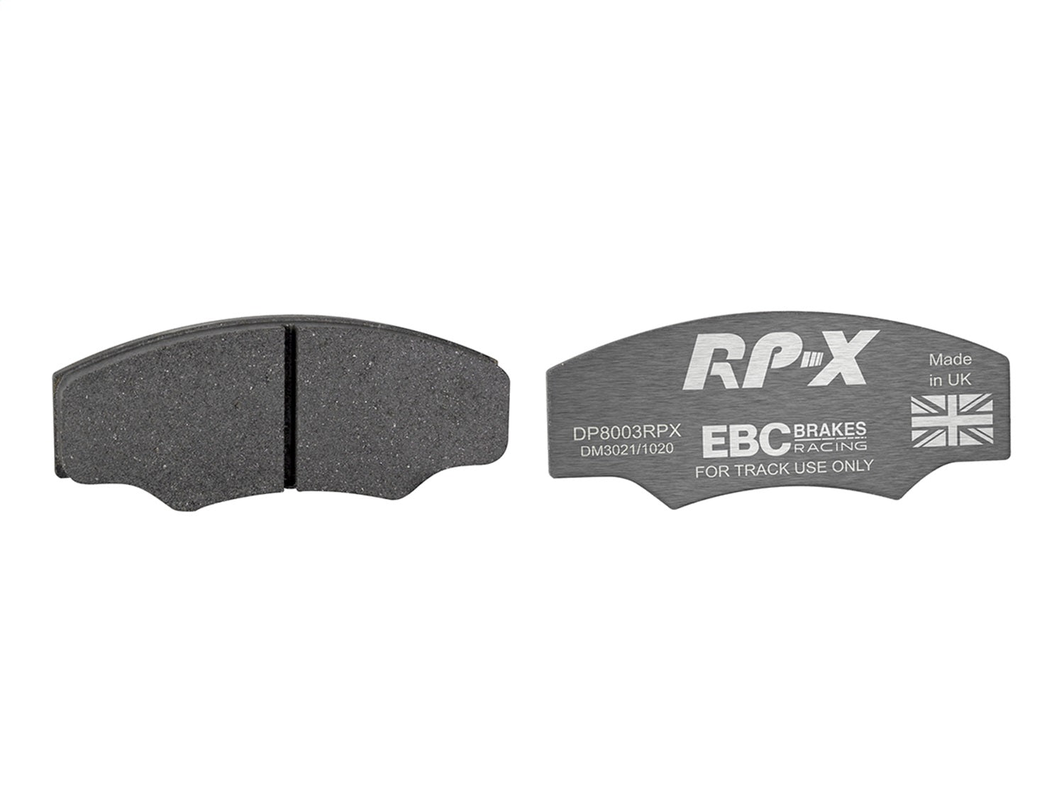 RP-X(TM) Racing Front Brake Pads by EBC(R). EBC Racings RP-X compound is an ultra-high performance track and race pad designed for performance vehicles driven hard on track and for dedicated race cars. RP-X has a very stable friction coefficient of 0.55 mu up to and beyond 850 C, making it an excellent performer for even the most demanding vehicle applications.