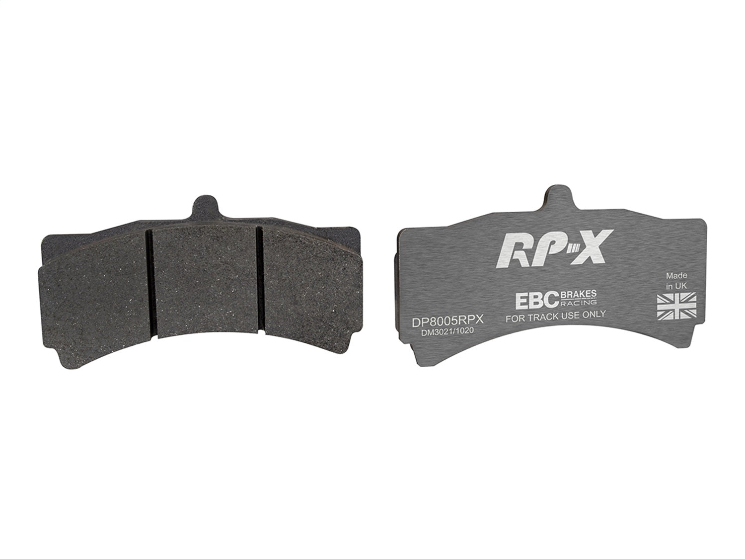RP-X(TM) Racing Front Brake Pads by EBC(R). EBC Racings RP-X compound is an ultra-high performance track and race pad designed for performance vehicles driven hard on track and for dedicated race cars. RP-X has a very stable friction coefficient of 0.55 mu up to and beyond 850 C, making it an excellent performer for even the most demanding vehicle applications.