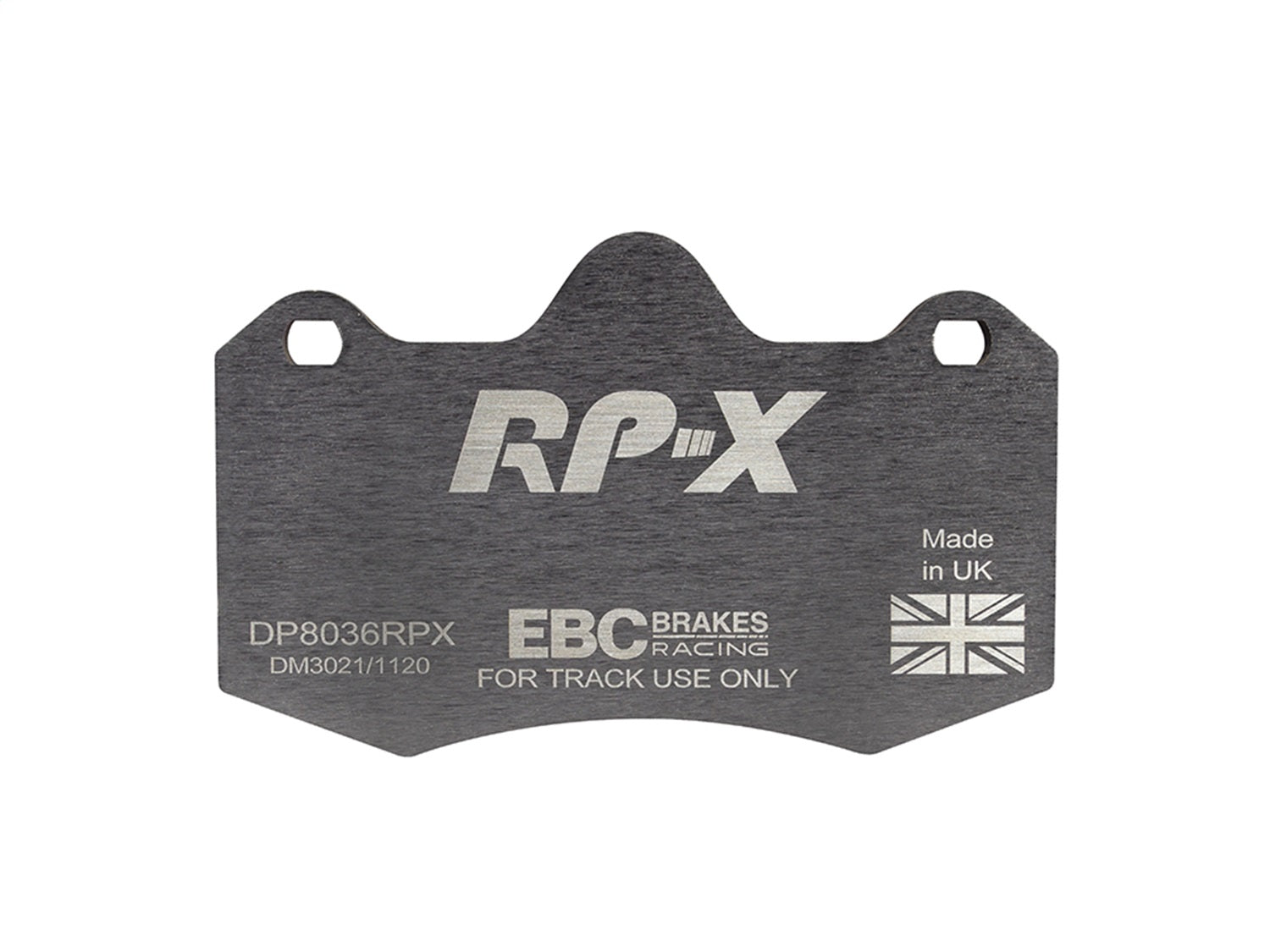 RP-X(TM) Racing Front Brake Pads by EBC(R). EBC Racings RP-X compound is an ultra-high performance track and race pad designed for performance vehicles driven hard on track and for dedicated race cars. RP-X has a very stable friction coefficient of 0.55 mu up to and beyond 850 C, making it an excellent performer for even the most demanding vehicle applications.