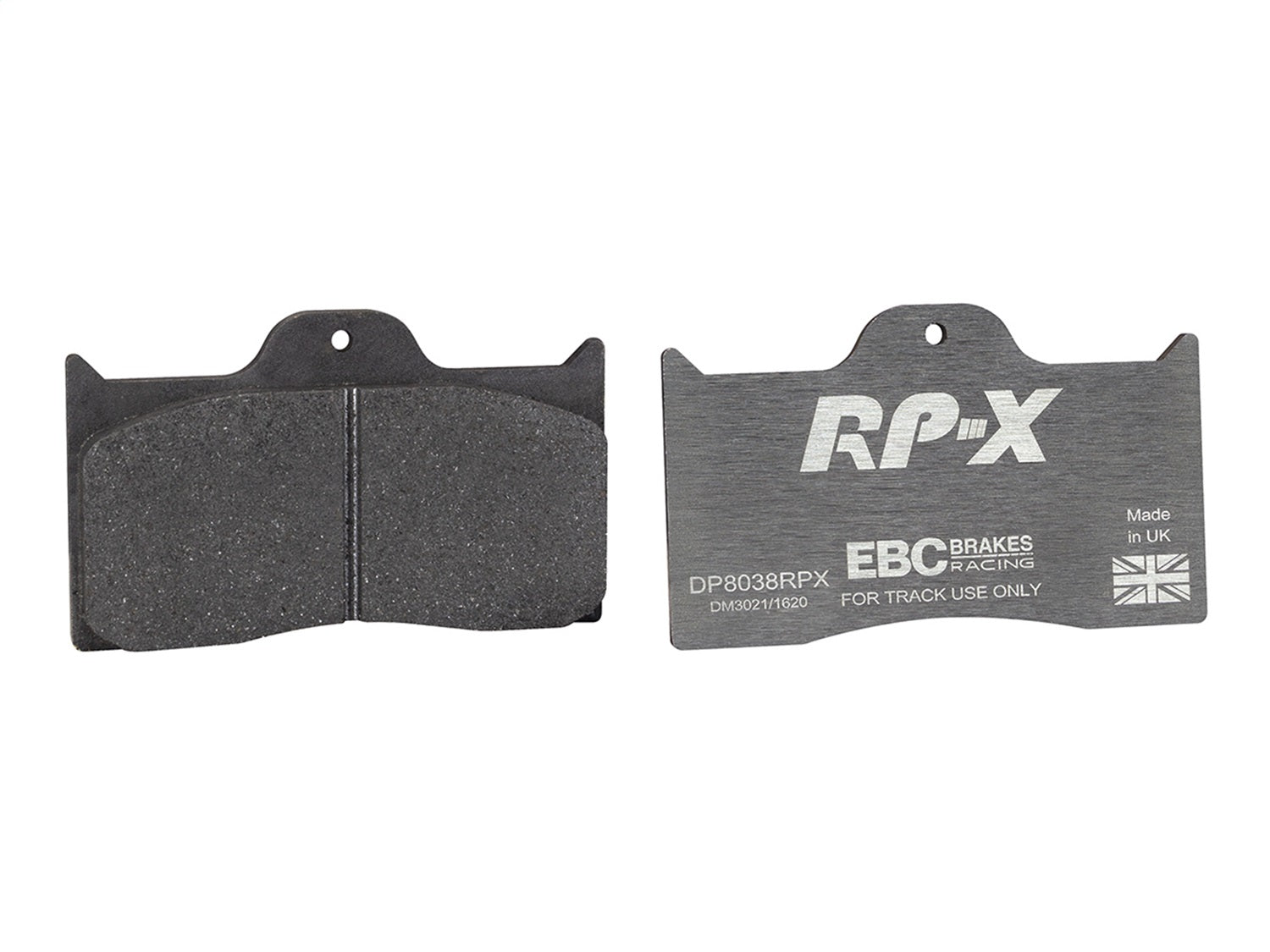RP-X(TM) Racing Front Brake Pads by EBC(R). EBC Racings RP-X compound is an ultra-high performance track and race pad designed for performance vehicles driven hard on track and for dedicated race cars. RP-X has a very stable friction coefficient of 0.55 mu up to and beyond 850 C, making it an excellent performer for even the most demanding vehicle applications.