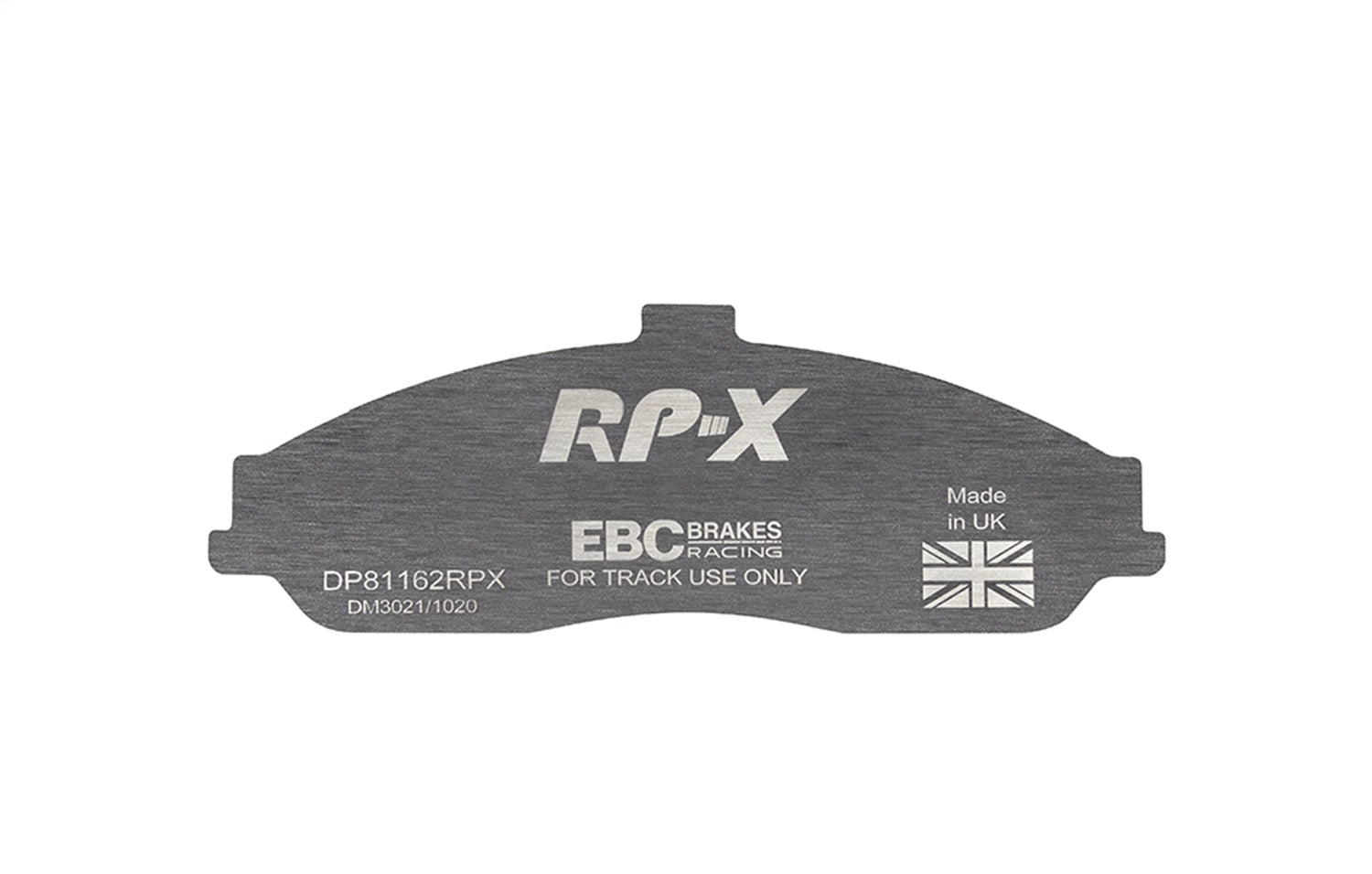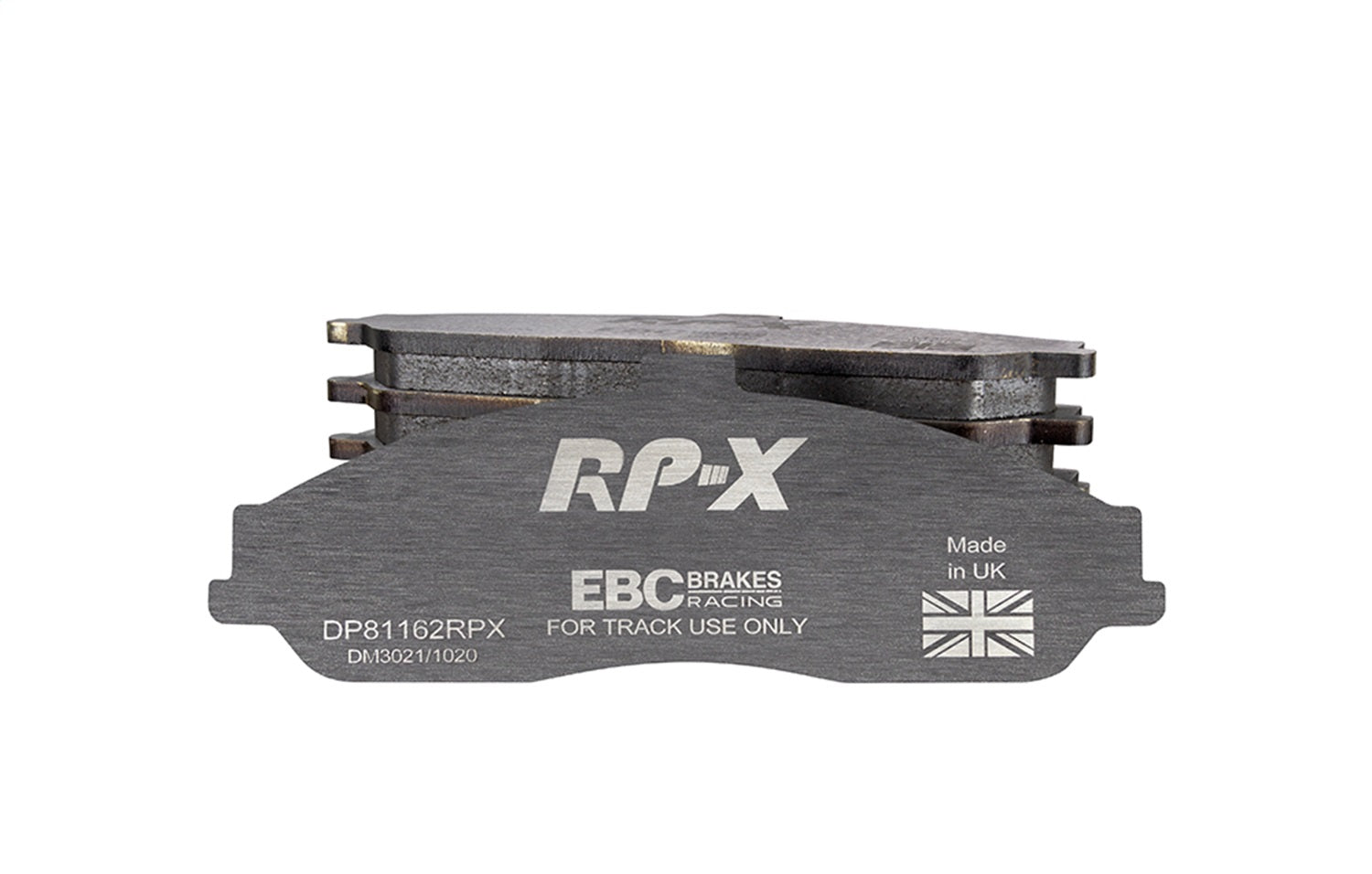 RP-X(TM) Racing Front Brake Pads by EBC(R). EBC Racings RP-X compound is an ultra-high performance track and race pad designed for performance vehicles driven hard on track and for dedicated race cars. RP-X has a very stable friction coefficient of 0.55 mu up to and beyond 850 C, making it an excellent performer for even the most demanding vehicle applications.