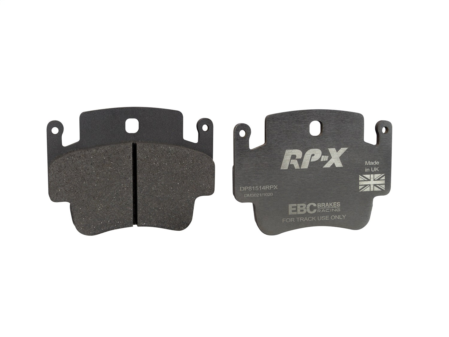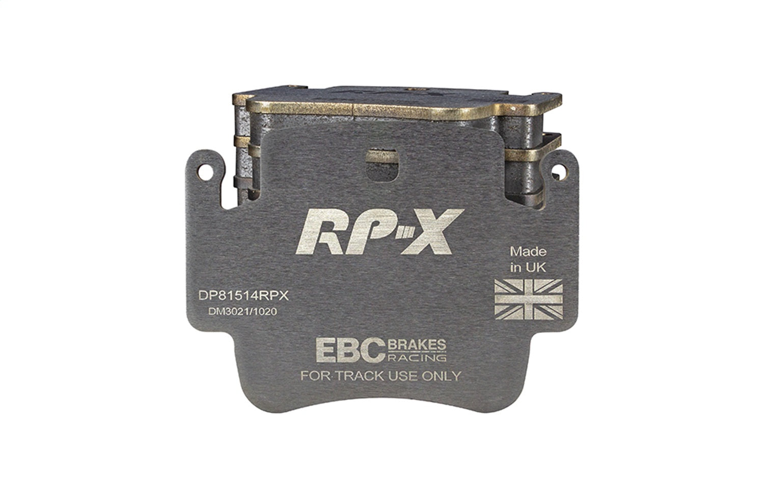 RP-X(TM) Racing Front Brake Pads by EBC(R). EBC Racings RP-X compound is an ultra-high performance track and race pad designed for performance vehicles driven hard on track and for dedicated race cars. RP-X has a very stable friction coefficient of 0.55 mu up to and beyond 850 C, making it an excellent performer for even the most demanding vehicle applications.