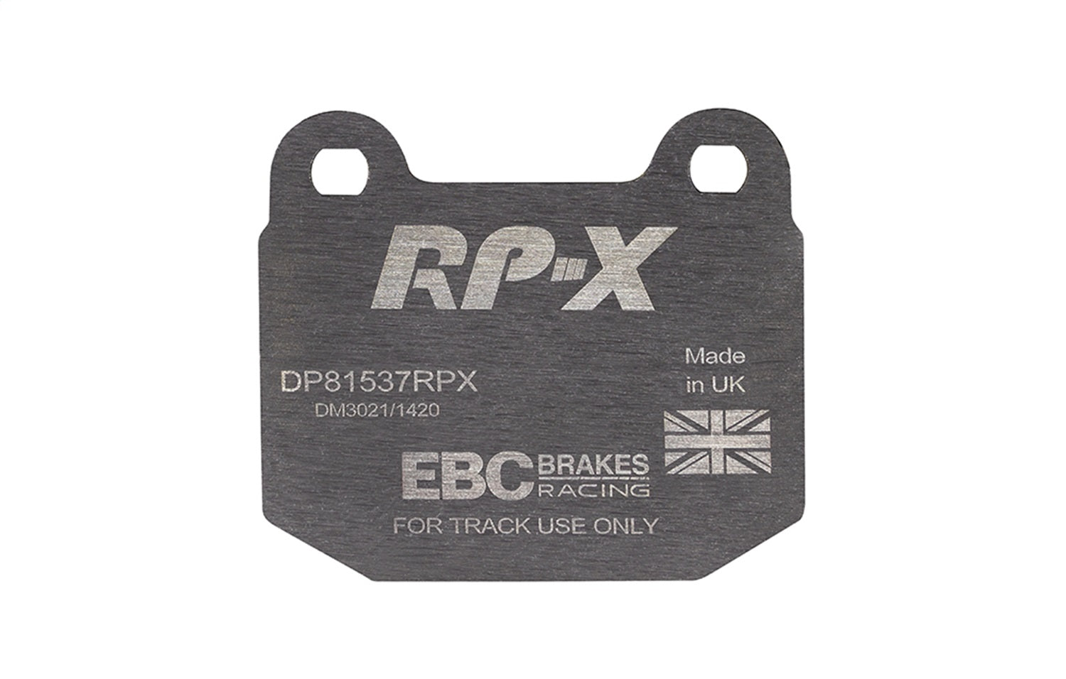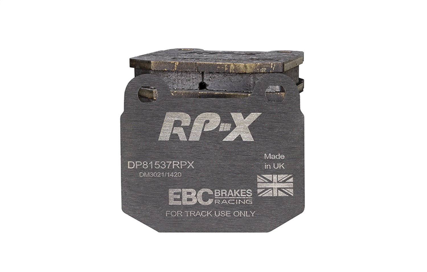 RP-X(TM) Racing Front Brake Pads by EBC(R). EBC Racings RP-X compound is an ultra-high performance track and race pad designed for performance vehicles driven hard on track and for dedicated race cars. RP-X has a very stable friction coefficient of 0.55 mu up to and beyond 850 C, making it an excellent performer for even the most demanding vehicle applications.