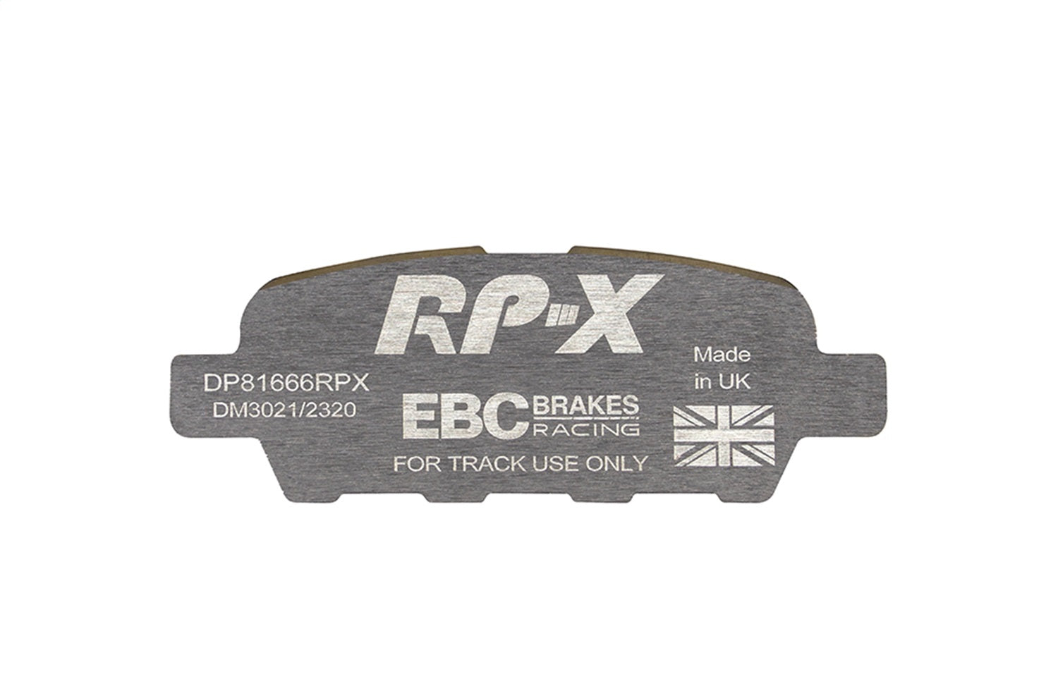 RP-X(TM) Racing Front Brake Pads by EBC(R). EBC Racings RP-X compound is an ultra-high performance track and race pad designed for performance vehicles driven hard on track and for dedicated race cars. RP-X has a very stable friction coefficient of 0.55 mu up to and beyond 850 C, making it an excellent performer for even the most demanding vehicle applications.