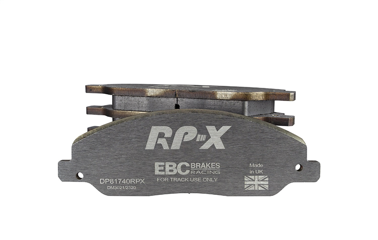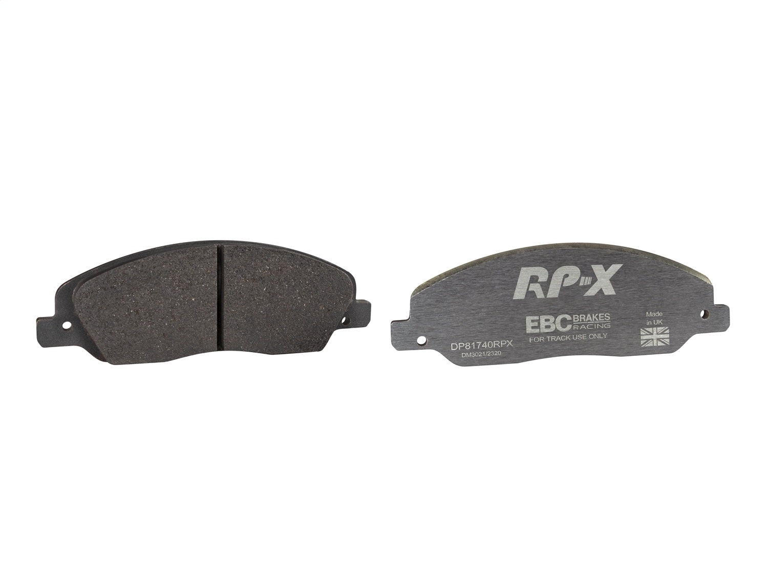RP-X(TM) Racing Front Brake Pads by EBC(R). EBC Racings RP-X compound is an ultra-high performance track and race pad designed for performance vehicles driven hard on track and for dedicated race cars. RP-X has a very stable friction coefficient of 0.55 mu up to and beyond 850 C, making it an excellent performer for even the most demanding vehicle applications.