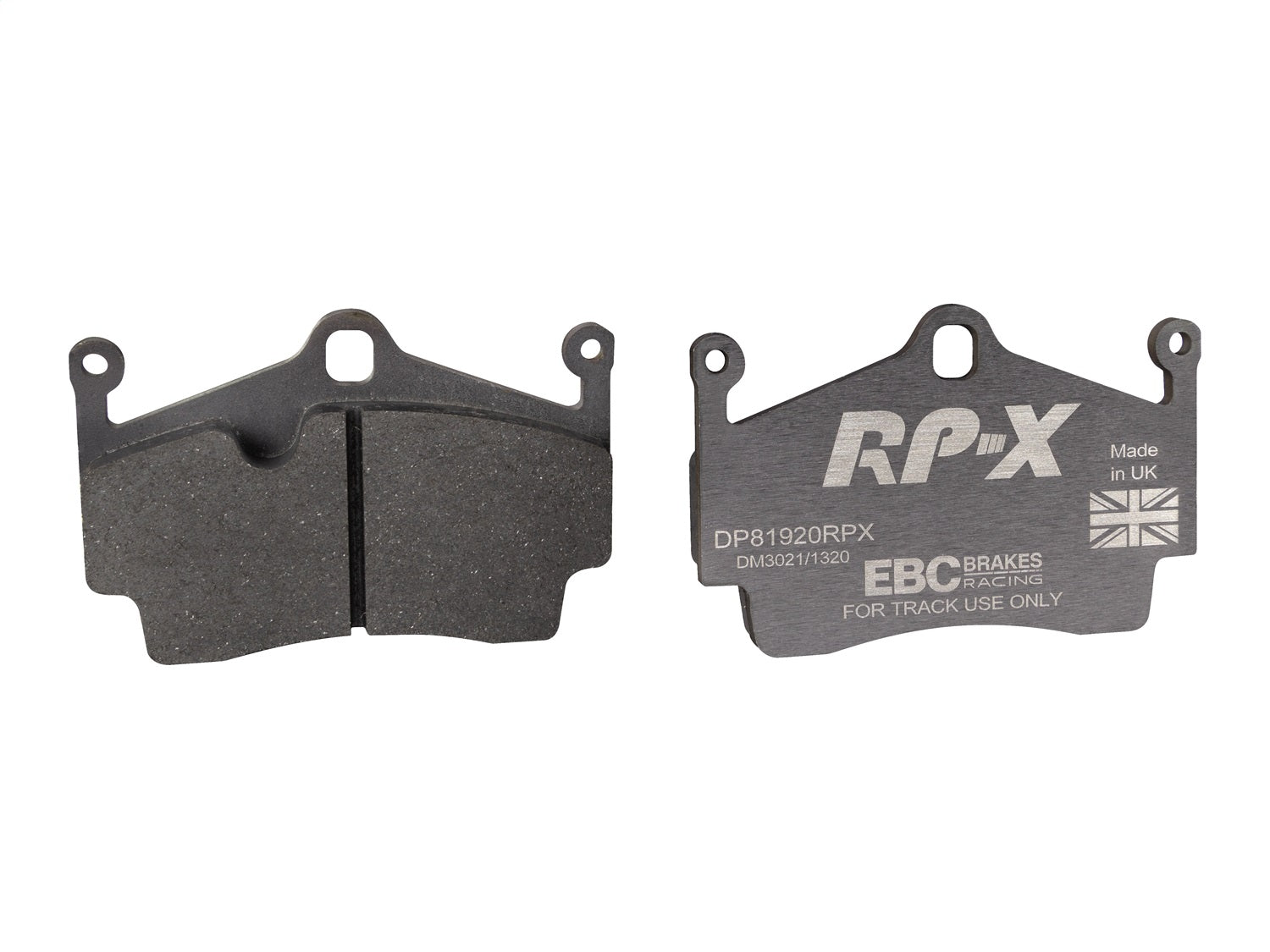 RP-X(TM) Racing Front Brake Pads by EBC(R). EBC Racings RP-X compound is an ultra-high performance track and race pad designed for performance vehicles driven hard on track and for dedicated race cars. RP-X has a very stable friction coefficient of 0.55 mu up to and beyond 850 C, making it an excellent performer for even the most demanding vehicle applications.