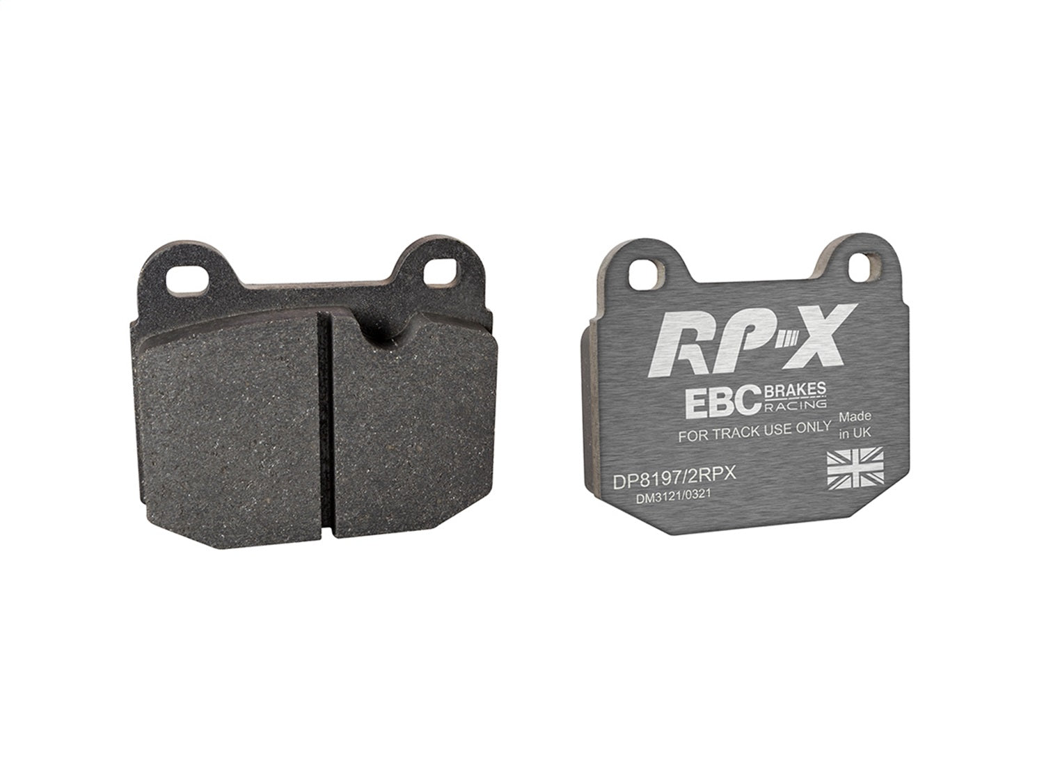RP-X(TM) Racing Front Brake Pads by EBC(R). EBC Racings RP-X compound is an ultra-high performance track and race pad designed for performance vehicles driven hard on track and for dedicated race cars. RP-X has a very stable friction coefficient of 0.55 mu up to and beyond 850 C, making it an excellent performer for even the most demanding vehicle applications.