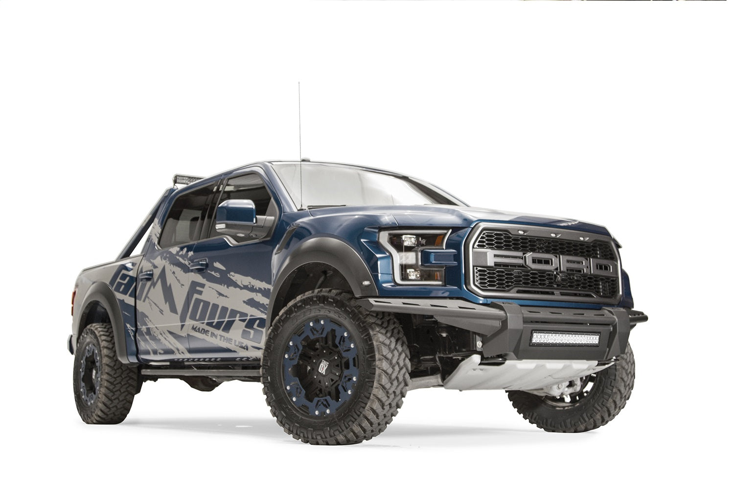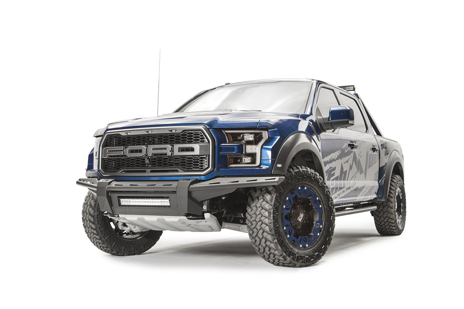 Fab Fours' newest Ultra Light Hybrid bumpers: AERO SERIES. By combining tube and plate steel these premium bumpers are constructed to be lightweight (weighing only 45bs), offer a sleek AEROdynamic design (with our Signature Fluted Castles') while providing optimal tire clearance. Engineered to retain factory skid plate and new technology features including Adaptive Cruise Control and Park Assist (with optional bracket M3850-1). Center Cutout for Rigid Industries 20 in. LED light bar. The fit of this bumper is high and tight and perfectly follows the vehicles body lines. Available in a no guard or pre-runner guard option.