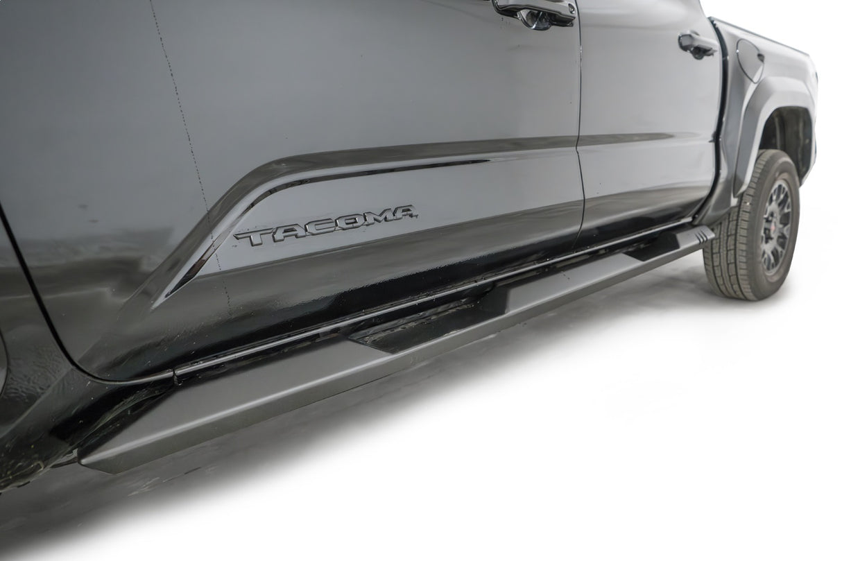 The Fab Fours' Toyota Tacoma Step Sliders offer superior strength, protection and styling. You can trust that your Tacoma will be protected and take the abuse from the harshest off road conditions. Key features include: Solid steel plate design, light vents & mounts for (3) rock lights, 2 stage epoxy matte black powder coat, Ease of Installation, 3/16 Inch Steel construction, Lightweight and Expertly Engineered for the Ultimate in customized Tacoma protection. Enjoy the fit and finish of a quality set of Step Sliders from Fab Fours - Made in the USA!