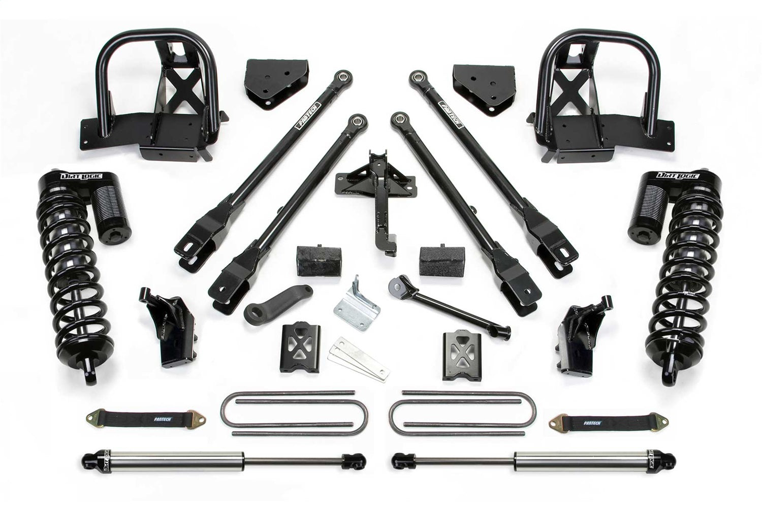For the ultimate in suspension performance for the Super Duty we offer a bolt on 4 Link System that provides unsurpassed articulation and wheel travel. These 2'' diameter heavy wall links feature race style 1'' Uniballs for superior strength. Thick 1/4'' steel brackets secure the 4 Links to the frame without cutting or welding. This 4 Link system includes our Dirt Logic 4.0 Stainless Steel adjustable Coilover Shock conversion. The system also includes Sway Bar Drops, Trac Bar relocation bracket, Pitman Arm, and a rear Block & U-Bolt kit. Includes rear 2.25 Dirt Logic Stainless Steel shocks.