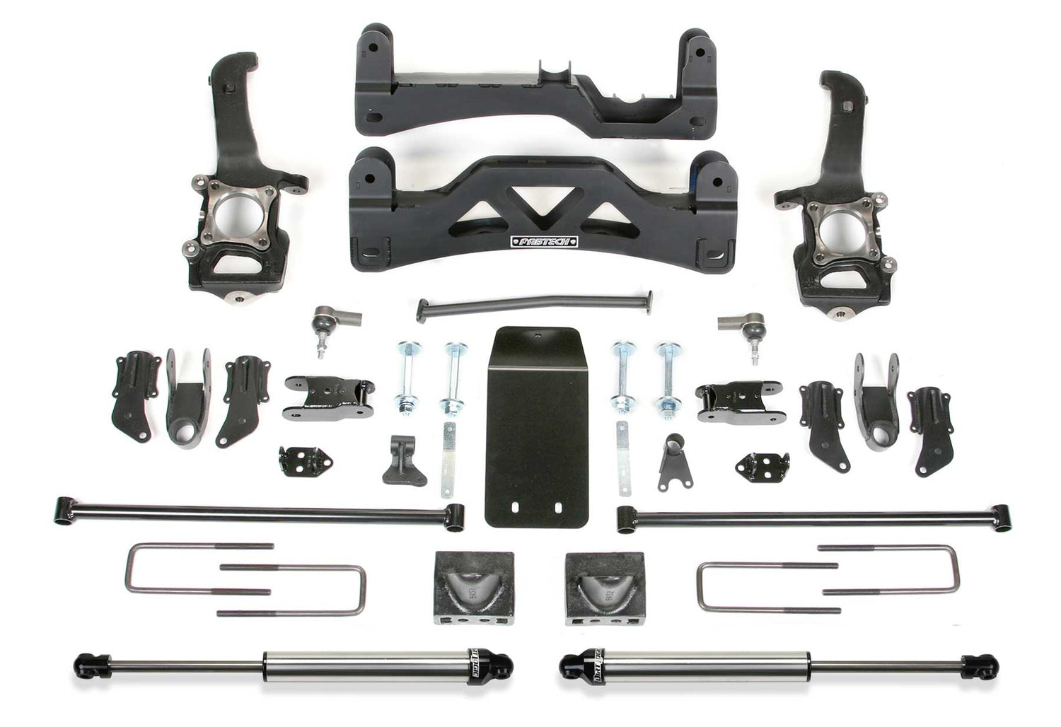 The Basic System utilizes a spacer with the factory coilover shock and features Fabtech's signature arched lower control arm crossmembers constructed of 1/4'' thick steel, with integrated differential skid plate to provide strength and rigidity to the front frame and suspension. Crossmembers include adjustable eccentric cams for easy front end alignment and ability to hold alignment under offroad conditions. Fabtech's proprietary steering knuckles are built with the finest American made ductile iron and will allow use of an 18'' or 20'' diameter wheel. Also included in these systems are sway bar brackets, impact struts, blocks and a u-bolt kit. Includes rear 2.25 Dirt Logic Stainless Steel shocks.