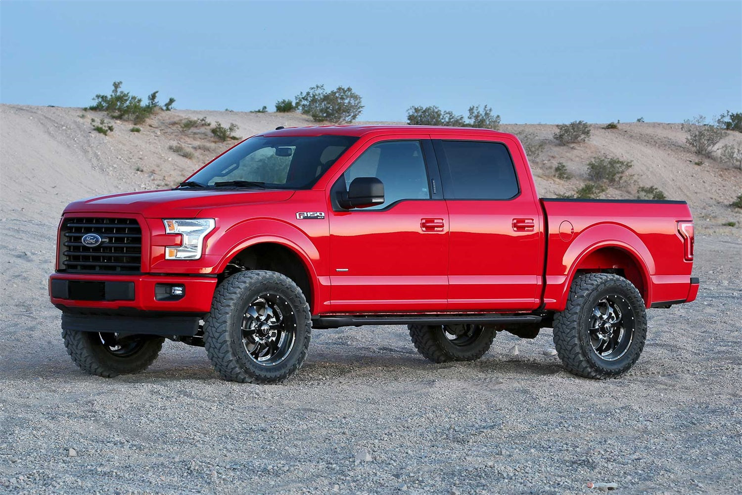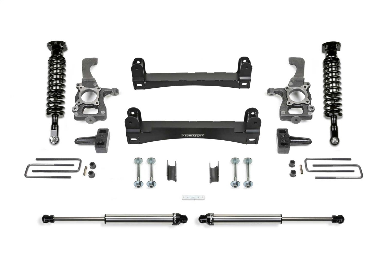 This system feature Fabtech?s proven IFS technology with extended length ductile iron steering knuckles for proper Ford electronic stability control functionality. Heavy duty 1/4? thick steel lower control arm crossmembers provide superior ground clearance for adventurous offroad trails. Rear lift is accomplished with a 2.25? lift block and extended length u bolts. The Performance system includes Fabtech?s legendary stainless steel Dirt Logic 2.5 Coilover shocks for outstanding damping capacity with a great highway ride. Rear shocks include the Dirt Logic 2.25. This high quality system does not require drilling or cutting for installation and comes Fabtech?s 5/60 Powertrain warranty. 1/4? thick steel lower control arm crossmembers are arched for maximum ground clearance. Four adjustable alignment cams provide a wide range of adjustment. The fully welded box design of these crossmembers provides additional strength to the front suspension. Extended length ductile iron steering knuckles retain near stock track width keeping the tires under the fenders. These steering knuckles are designed to work in conjunction with the Ford ESC for proper functionality at all speeds. The Brake Line Brackets reposition the factory Ford brake lines down on the frame for the new travel range without having to open the brake system. Keeps factory fluid system intact. 1/4" thick steel drop brackets reposition the front sway bar for the increased ride height. This allows the sway bar link ends to fully cycle without binding throughout the extended travel range. 2.25" Tall rear lift blocks replace the factory blocks without changing the ride quality or load carrying capacity. American made U Bolts that retain the entire rear differential to the vehicle. A critical part that demands the best quality for your vehicle.