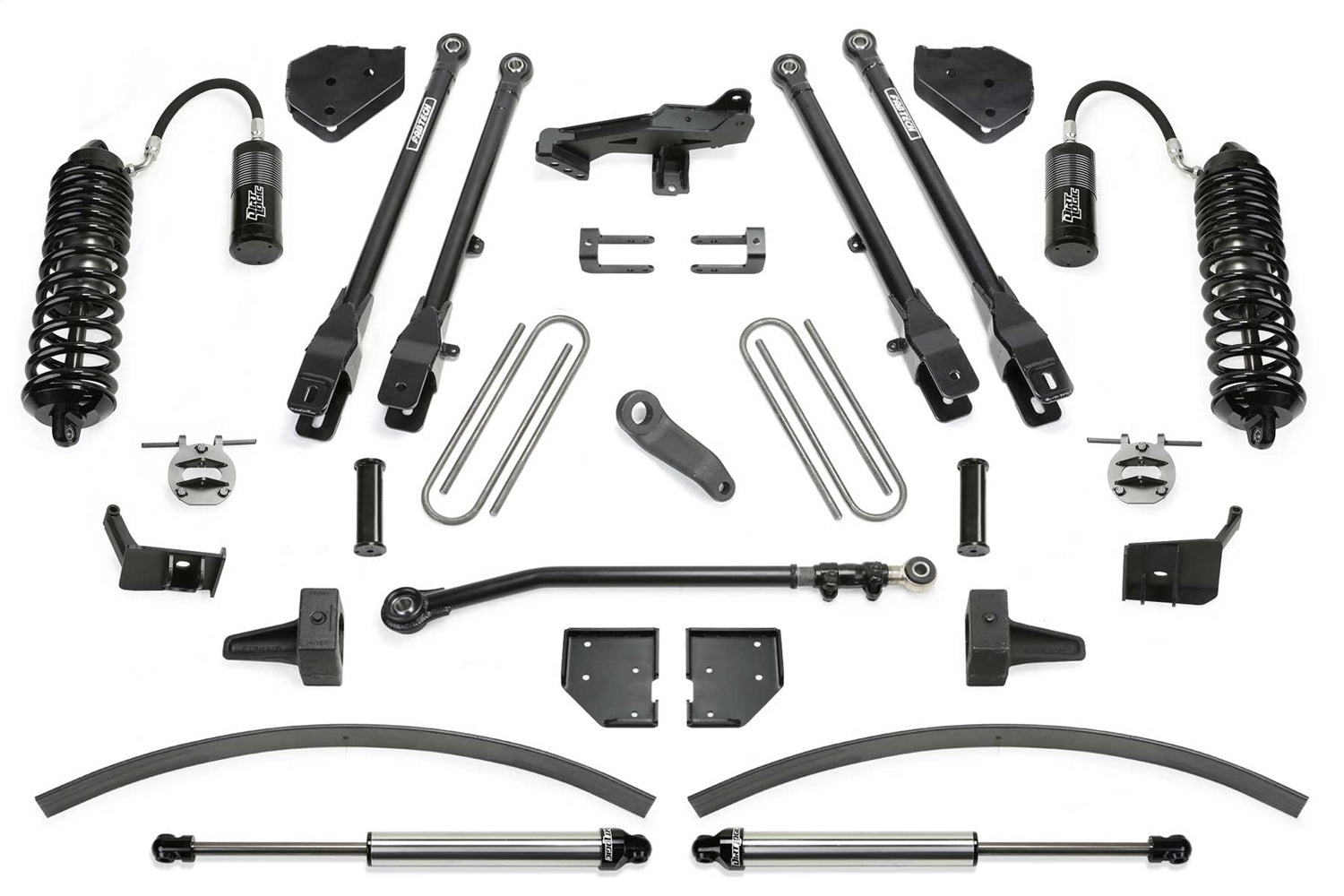 Fabtech?s 8? 4 Link Conversion System for the Ford Super Duty is designed to provide maximum suspension performance for both on and offroad use. The system replaces the factory Radius Arm suspension with heavy duty 4 Link components for increased strength and functionality. The system will provide less caster change throughout the travel range which benefits on road driving. When offroad the 4 Link system will provide more articulation than a Radius Arm for increased terrain traversing at all speeds. Unique to this 8? system is Fabtech?s extended length Track Bar to address the hyper sensitive steering box of the late model Super Duty. Fabtech is the only manufacturer with this exclusive system that offers proper steering performance. Fabtech?s extended length Track Bar is 4? longer than stock and is offset to the driver side with a stout 1/4? thick steel mounting bracket. This design helps keep the Track Bar and Draglink closer to parallel than the factory angles to reduce push in the steering. The Track Bar allows for full lock steering of 15.50 wide tires w/ 4-3/4? BS wheels. Included in this system is the massive Dirt Logic 4.0 Resi Coilover Conversion for outstanding damping capacity offroad with a quality on road ride. The Coilover bolts in place of the factory coil spring without removal of the coil spring bucket. The giant 4? diameter aluminum remote reservoir mounts horizontally above the Coilover to allow for full compression travel with oversized tires. The Dirt Logic 4.0 Resi Coilover is the biggest and baddest on the market for the Ford Super Duty. Fabtech?s 4 Link System has been proven in over 10 years of service in rugged commercial and military applications to ensure long life on your daily driven vehicle. High quality components with properly designed suspension geometry makes this Super Duty system the pinnacle of all suspensions. Comes with a free 5 year 60,000 mile powertrain warranty.