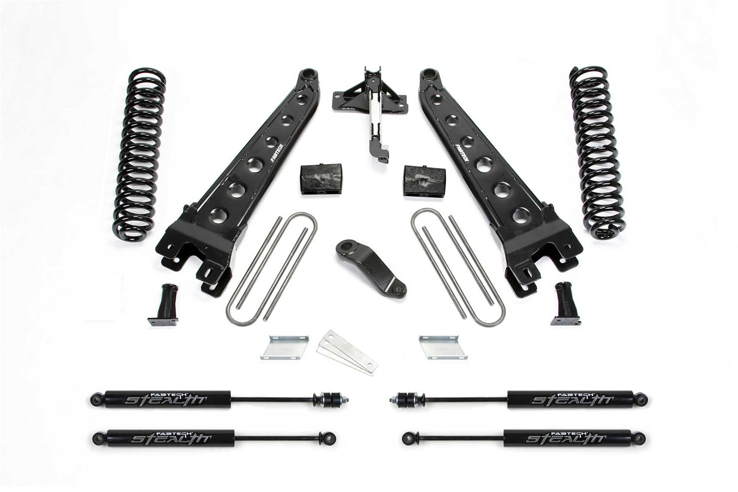 Fabtech's 6in Radius Arm lift kit for the Ford F450 and F550 Super Duty is built to handle the on and offroad demands of the truck enthusiast. This vehicle's suspension is more robust than the Ford F250 and F350 and therefore demands specialty parts only available from Fabtech. This Radius Arm system is a complete upgrade to the factory suspension and will provide additional strength for use with oversized tires. The design has been proven in over 10 years of service in consumer, commercial and military applications. High quality components with properly designed suspension geometry is what sets this system apart from all other Radius Arm suspensions. Each Fabtech component has been designed with specific features and benefits that create this quality suspension system. For a greater understand of each these components please see below. FEATURES: RADIUS ARM - Tubular construction with dimple die side plate for superior strength. Arms are offset to allow for full turning radius of the Dana Super 60 front axle with wide tires. Fabtech Radius Arms have 1 degree of caster built in for the increased ride height. Adjustable alignment cams on the Arms allow for an additional 1.5-2 degrees of caster adjustment. COIL SPRINGS - American made coil springs have been designed for a very compliant ride quality both on and offroad. Each coil is preset during the manufacturing process to insure no ride height settling over time. Allows for a 2in increase in wheel travel over stock when used with Fabtech shock absorbers. TRACK BAR BRACKET - 1/4in thick steel bracketry repositions the factory track bar to center the axle under the vehicle with the increased lift height. Super stout box style bracket is designed to eliminate deflection when the track bar moves through its full cycle. DROPPED PITMAN ARM - Forged steel construction with high strength material that exceeds the factory specifications. Designed specifically for the F450 and F550 to work in conjunction with the facto