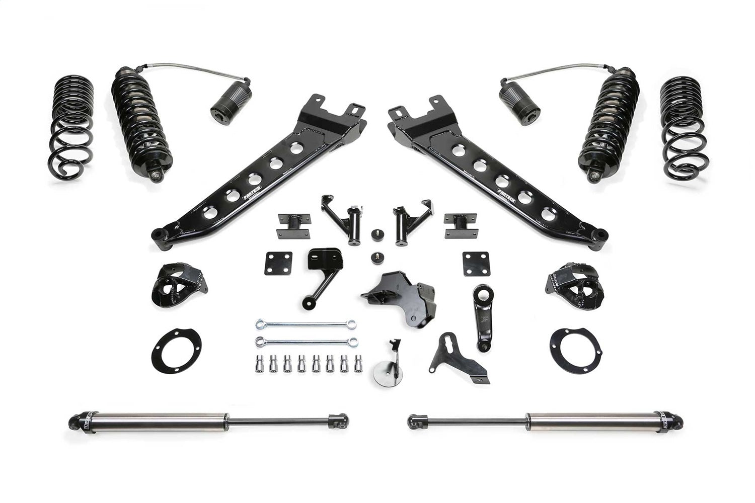 Improving on the Ram suspension design, Fabtech offers their trademark Radius Arms in a complete lift kit. These exclusive tubular Radius Arms have recognizable dimple die side plates for superior strength and a signature of quality. The rugged Arms provide increased caster for use with oversized tires and lifted suspension heights. For maximum suspension damping, this Ram lift kit features the massive stainless steel Dirt Logic 4.0 Coilovers. These top shelf Coilovers bolt to the factory upper coil bucket with support gussets for superior strength. The lower mounts weld to the axle housing and have cross support gussets for the factory Track Bar bracket. Heavy duty 1/4" thick steel front and rear Track Bar drop brackets center the axles under the vehicle with the new ride height. For the rear, this lift kit has the perfect balance between ride quality and retaining the factory carrying capacity. By utilizing a dual rate spring design, it provides a good highway ride in the first stage of compression then the second stage handles heavy loads. This high end lift kit system is the ultimate suspension upgrade for Ram 2500. FEATURES: Fabtech?s trademark Radius Arms with recognizable dimple die side plates providing additional strength and increased caster. Bolt on Ram Coilover Conversion for the best ride quality on and offroad. Heavy duty Track Bar drop brackets center the axles under vehicle for proper tracking. Dual rate rear coil springs for factory load capacity and a smooth ride. Includes Free 5 year 60,000 mile Powertrain warranty. RADIUS ARM: Tubular construction with dimple die side plates for superior strength. Arms are offset to allow for full turning radius with wide tires. Fabtech Radius Arms have 1 degree of caster built in for the increased ride height. Adjustable alignment cams on the Arms allow for an additional 1.5-2 degrees of caster adjustment over stock. FRONT DIRT LOGIC 4.0 RESI COILOVERS: Super stout 1/4? thick steel brackets utilize