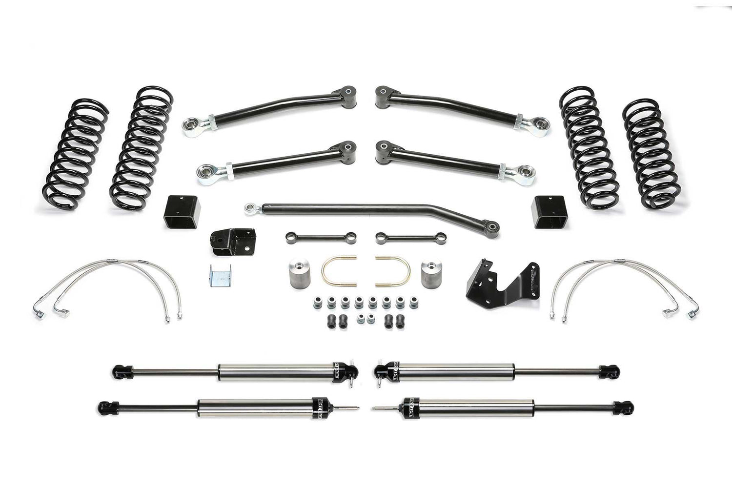 Utilizing the factory link arm mounts Fabtech's Trail short arm suspensions are built for aggressive offroad use while providing a smooth and quite highway ride. Each system has features and benefits that address all variants of off highway travel use including rock crawling, aggressive trail use and overland expeditions. The Trail system replaces the four lower link arms due to their vulnerability to offroad obstacles. Link arms come with large poly urethane bushings on one end with internal threads on the other to accept the ground breaking Fabtech 5 Ton Joint for longevity and a quite ride. These systems utilize Fabtech's Standard coil springs that are a single rate design and provide great all around suspension performance. Factory load carrying capacities are retained in these quality springs. Includes Lower Short Arm Links Front & Rear, Standard Coil Springs Front & Rear, Adjustable Track Bar Front, Sway Bar Links Front, Track Bar Bracket w/ Support Rear, Brake Lines Front & Rear, E Brake Bracket, Front Bump Stop Extensions, Rear Bump Stop Brackets and Dirt Logic 2.25 shocks.