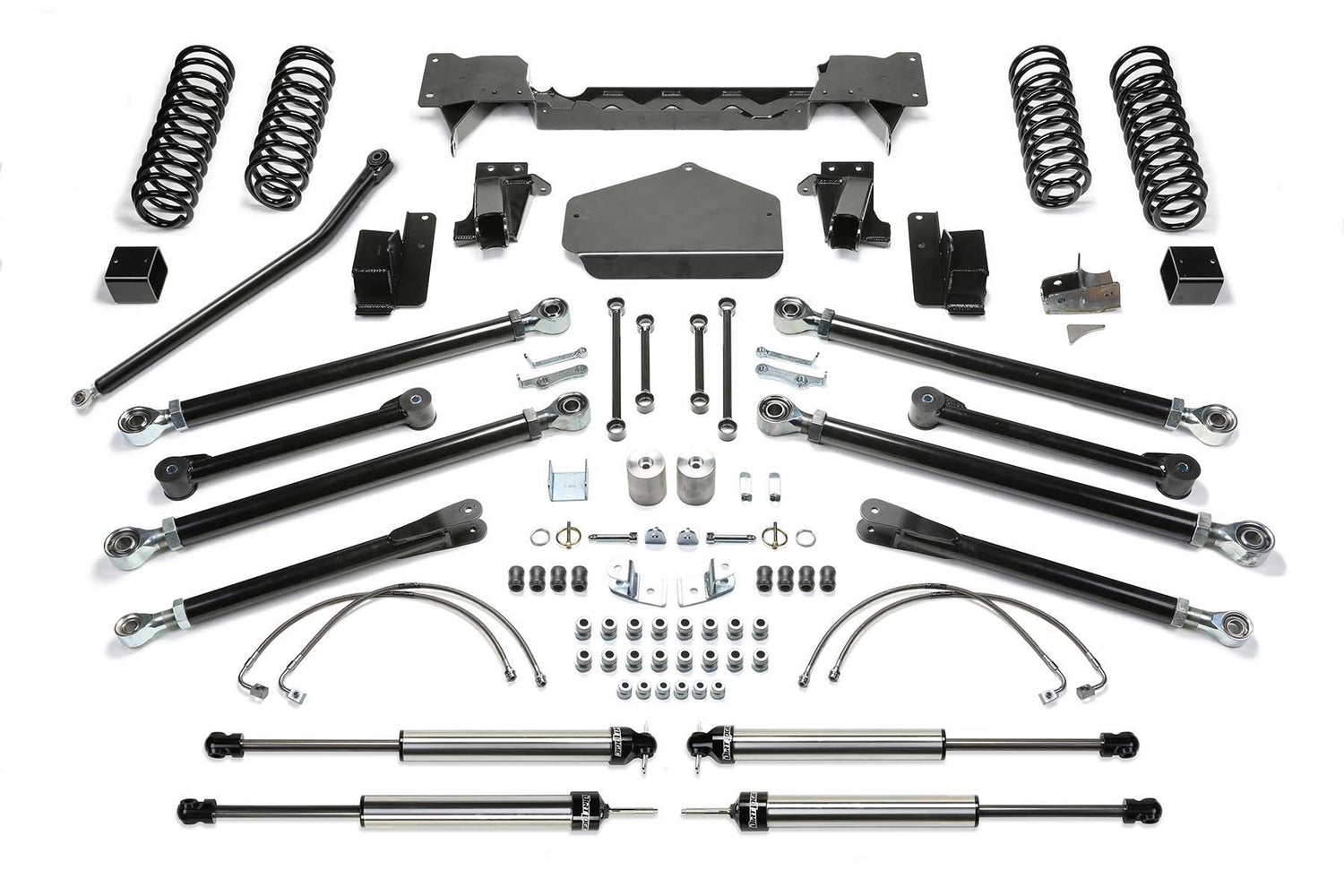 Fabtech's Crawler long arm coil systems replace all eight of the link arms with extended length units to allow for smooth operation at extreme angles. The link arms are mounted up high on the frame to increase ground clearance without the need to bend the Links as with other long arm systems on the market. Construction of the link arms is nothing short of the best heavy duty units you can buy. Each lower link is built from 2'' OD .313 thick wall DOM that is so strong Fabtech provides a warranty against bending. Link arms are internally threaded to accept the ground breaking Fabtech 5 Ton Joint that is guaranteed never to wear out. Weld on 1/4'' thick steel Track Bar brackets provide the proper roll center front and rear and will not fail leaving you stranded. This system utilizes Fabtech's Standard coil springs that are a single rate design and provide great all around suspension performance. Factory load carrying capacities are retained in these quality springs. Includes 8 Long Arm Links & Mounts, Standard Travel Coil Springs Front & Rear, Sway Bar Links Front & Rear, Adjustable Track Bar Front, Track Bar Bracket Rear, Brake Lines Front & Rear, E Brake Bracket, Front Bump Stop Extensions, Rear Bump Stop Brackets and Dirt Logic 2.25 shocks.