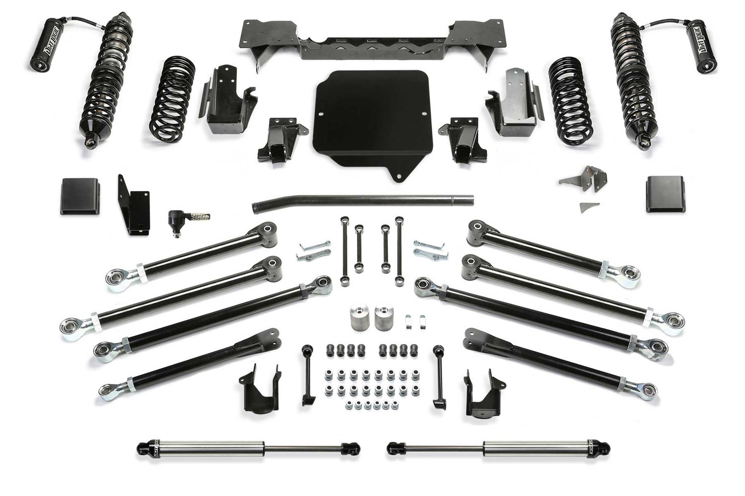 Fabtechs Jeep Crawler long arm system with the Dirt Logic 2.5 Coilover Conversion is the pinnacle of Jeep suspension performance. The ride quality of this kit is outstanding with the ability to endure severe offroad use that is suited for core rock crawlers, overlanders or for those that just want a plush ride. The conversion includes heavy duty 1/4" thick steel bracketry that attaches to the side of the Jeep coil spring bucket and to the frame for stout mounting of the Dirt Logic Coilovers. The Dirt Logic 2.5s Coilovers are the only all stainless steel body shock on the market. This is the most corrosive resistant shock there is. The ride quality of these Coilovers are vastly superior to a coil spring and shock configuration. This is the single biggest improvement you can do to your Jeep Gladiator to enhance the ride quality both on and offroad. A key part of the Crawler system is the link arm geometry. The location of the link arms to the frame is critical in providing superior handling throughout the travel range. Fabtech has found the sweet spot geometry for the link arms that provide a superior driving Jeep long arm system compared to all others on the market. Front link arms are mounted to a full width crossmember that spans frame rail to frame rail. This crossmember is a key in not only in mounting the Links arms at the correct geometry but it adds critical strength to the Gladiator frame for hard offroad use. Rear links attach to the factory frame and axle brackets for an easy install. The Fabtech lower Link Arms are massive and built of 2" OD .313" thick wall tubing that is guaranteed not to bend. Upper and lower Link Arms includes the Fabtechs legendary 5 Ton joints that come with lifetime guarantee of never wearing out. They are superior for offroad use with a smooth and quiet operation on the street. Each Fabtech component has been designed with specific features and benefits that create this quality suspension system. FEATURES - COILOVER CONVE