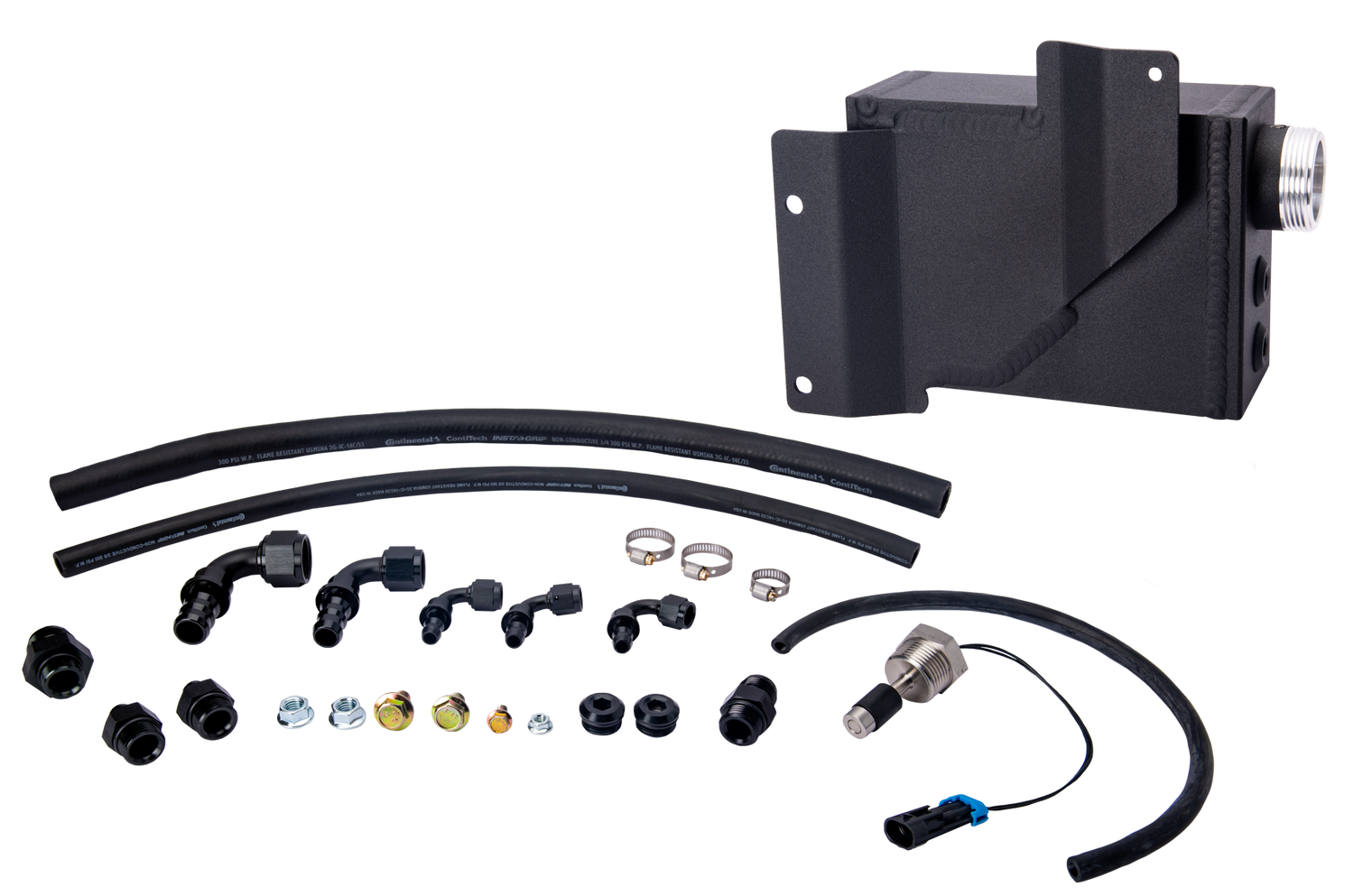 The Fleece Performance coolant tank replaces the factory coolant tank and moves the location closer to the battery box allowing for more engine compartment space. The tank features an integrated coolant level sensor that connects to the factory harness. All aluminum construction and powder coated black.