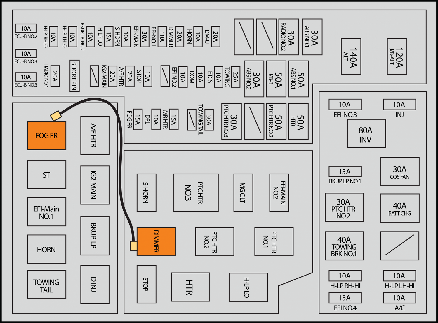 - Remove the relays labeled: FOG FR and DIMMER
