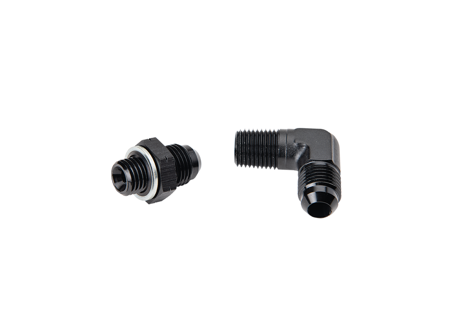 Includes: -6AN to M12 aluminum fitting with sealing washer and 90 degree 1/4 inch NPT fitting