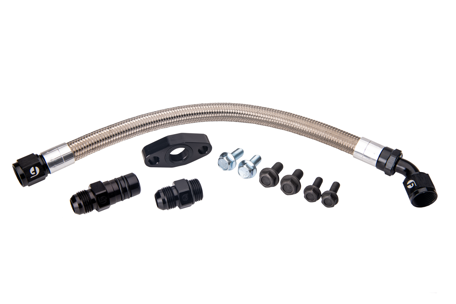 The fittings are 6061 aluminum with black anodize and come complete with o-rings. The kit contains everything you need to connect your turbo to the factory drain location on your block when doing a 2nd Gen Swap.
