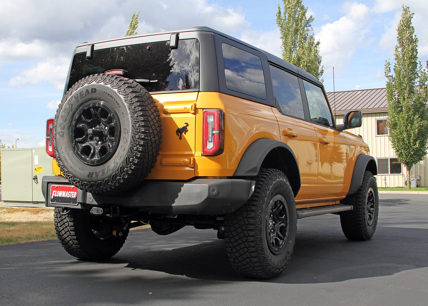 Looking for the perfect balance between a mild tone while cruising and at idle, but aggressive tone under throttle all while having no drone? The American Thunder axle-back exhaust system is perfect for the daily driven 2021-2024 Ford Bronco with the 2.3 or 2.7-liter engine. This system uses a tuned 60 Series style muffler for an aggressive to moderate exhaust tone and increased performance. Maximum dyno gains of 19 hp and 19 lb-ft. were measured at the rear wheels. 3.00-inch mandrel bent 409 stainless steel tubing is used to maximize exhaust flow and durability. A polished 3.00-inch stainless steel tip is used to add a custom look to this iconic vehicle. All of the necessary hardware is included and factory mounting locations are used for an easy installation. Backed by Flowmaster's Lifetime Limited Warranty.