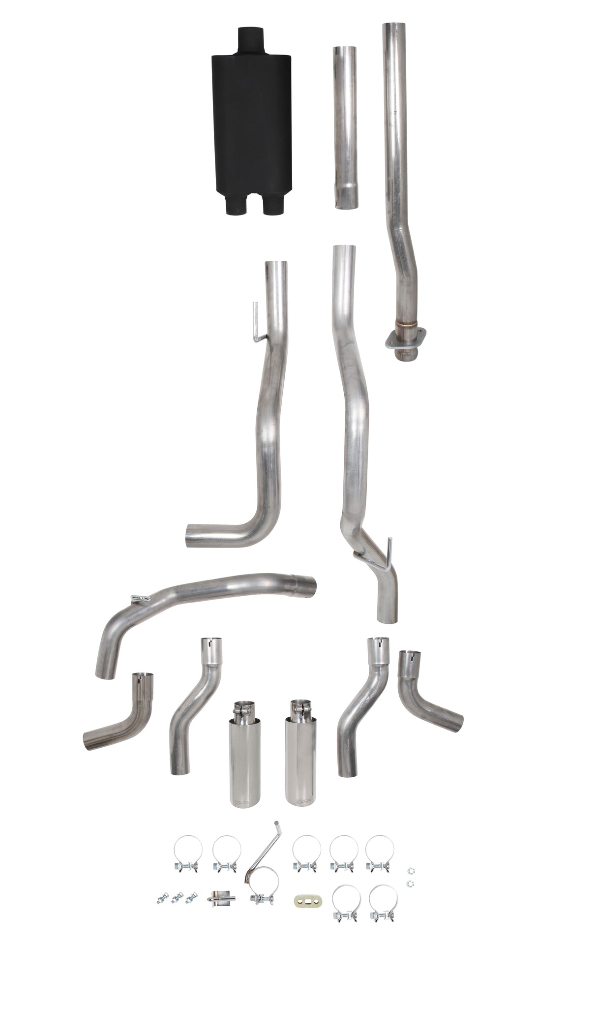 Cat-Back Exhaust System; 3 into Dual 2.5 in. Tubing; 409 Stainless Steel; Dual Rear Exit; Incl. Inlet-Extension-Side Exit-Rear Exit Pipes/Muffler/Dual 4 in. Polished Tips;