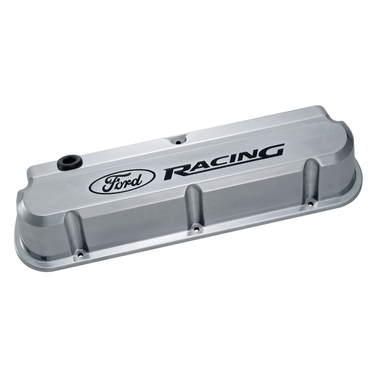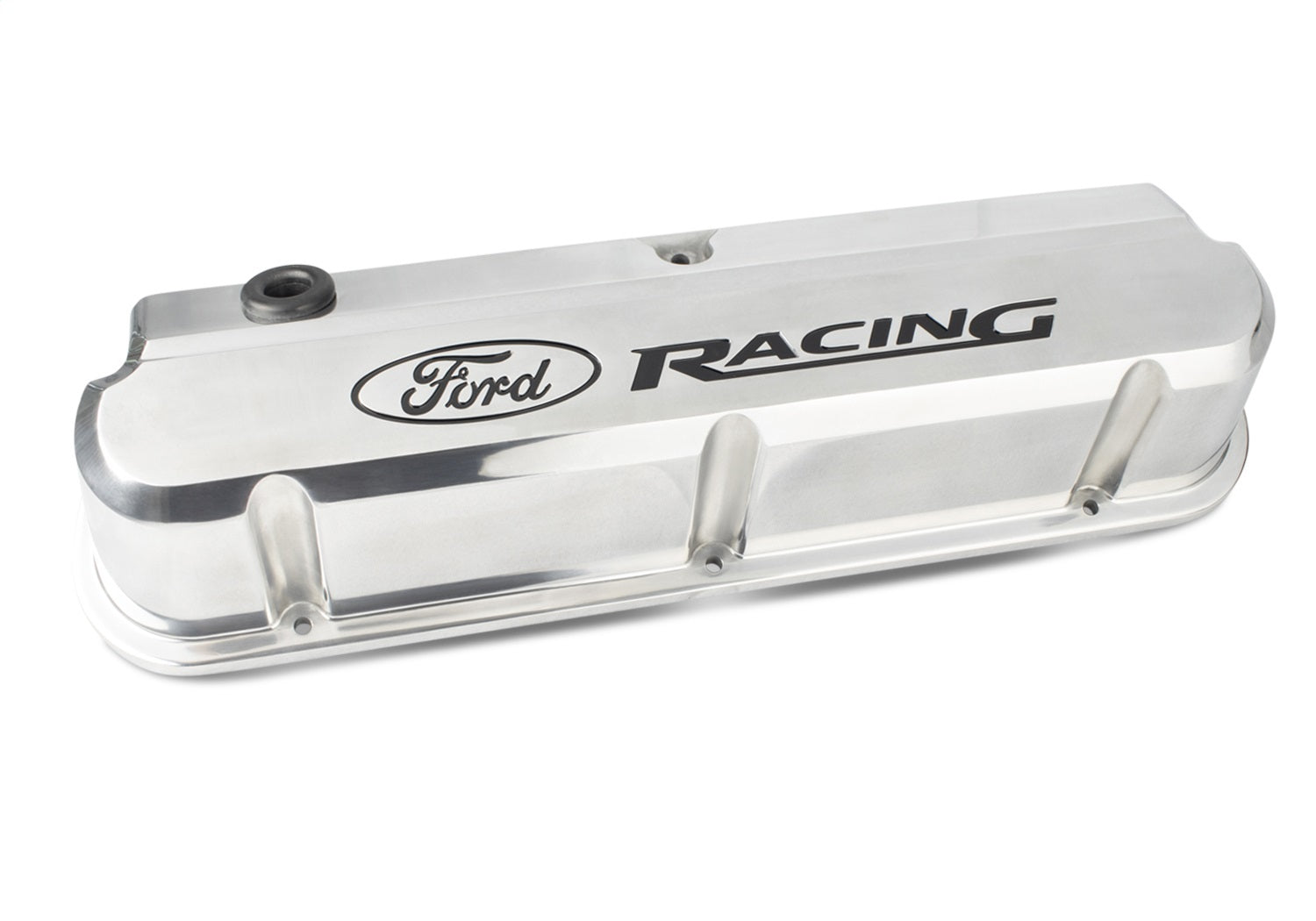 Slant Edge Valve Cover; 3.35 in. Tall; Die-Cast Alum. w/Baffle; Polished Finish; Raised Ford Racing Logo; Incl. Long Bolts/Oil Fill Cap Grommets;