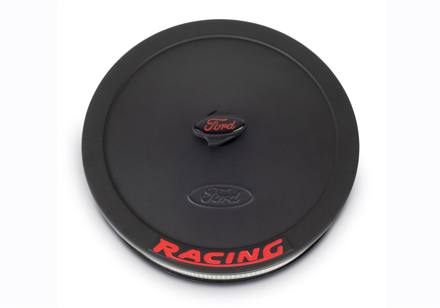 Air Cleaner Assembly - 13 in Round - 2.625 in Element - 5-1/8 in Carb Flange - Dropped Base - Red Ford Racing Logo - Steel - Black Crinkle Paint - Kit