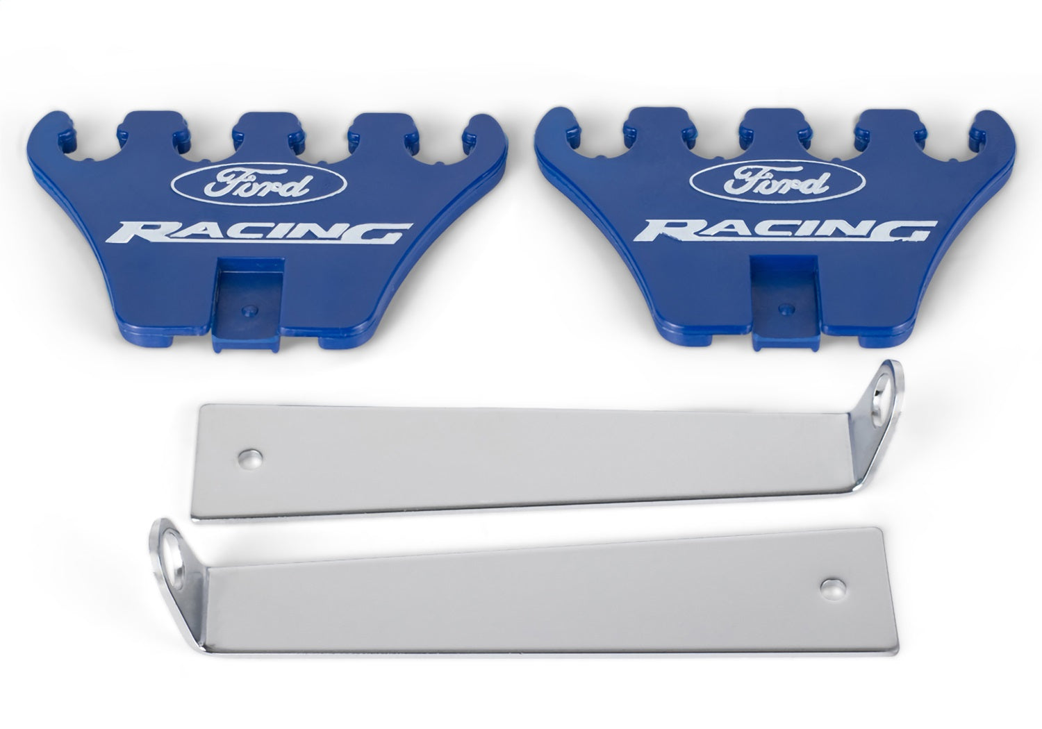 Spark Plug Wire Loom - 4 Wire - Valve Cover Mount - 7-8.5 mm - Chrome Bracket Included - Ford Racing Logo - Plastic - Blue - Clip Style - Small Block Ford - Pair