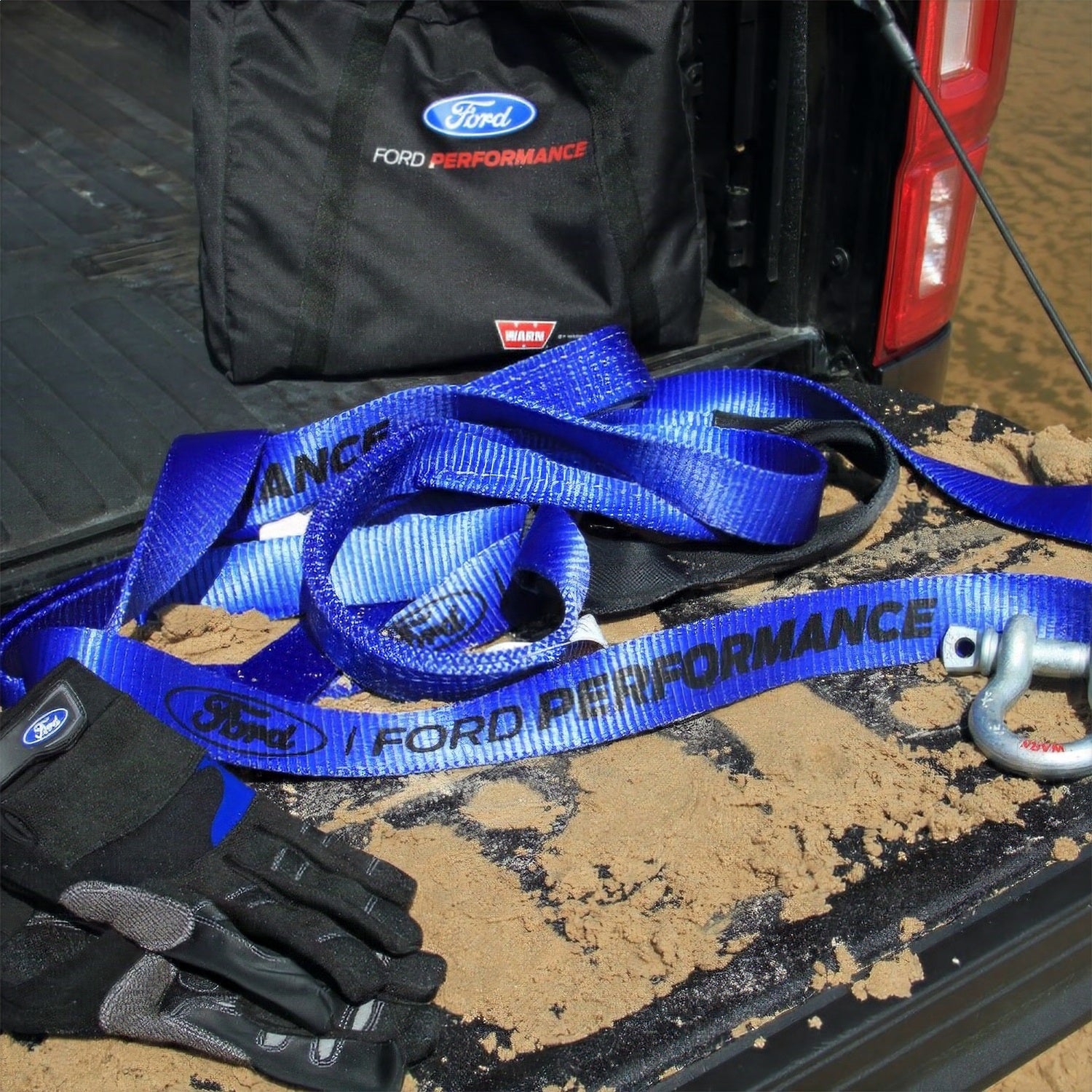 Ford Performance by WARN® Recovery Kit; Heavy Duty; Storage Bag/Tote; 3 in. x 30 ft. Blue Recovery Strap; 4 in. x 9 ft. Tree Trunk Protector; Incl. Winching Gloves;