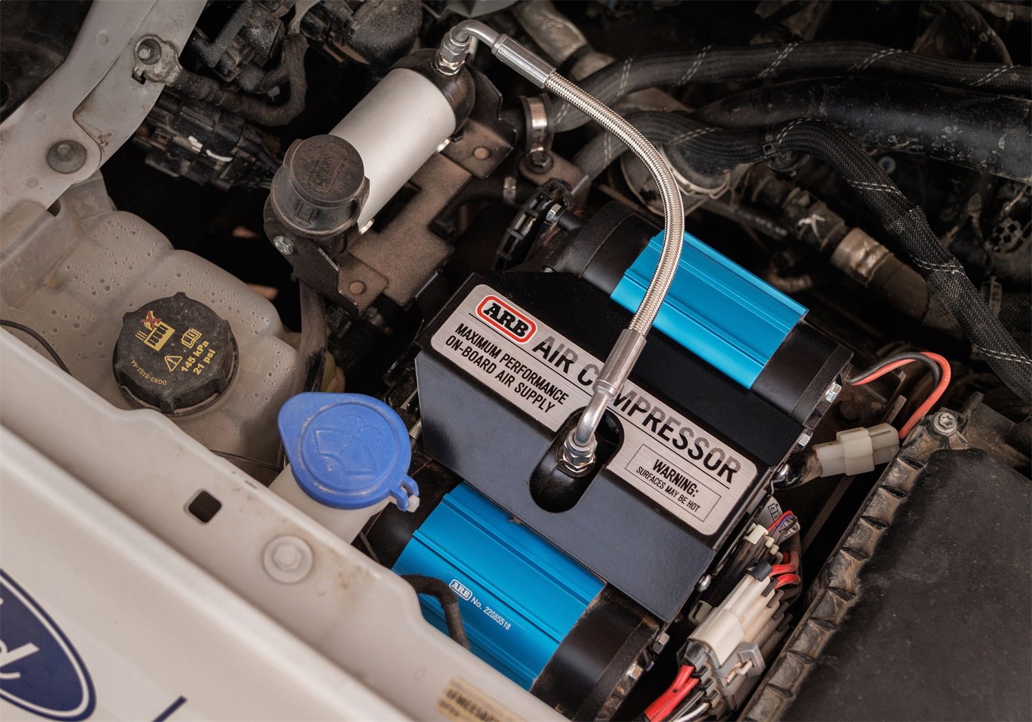 The Ford Performance by ARB Bronco On-Board Dual Air Compressor kit is perfect for airing up your tires after a fun day of Off-Roading/Overlanding. The under-hood mounting kit includes the ARB twin compressor, switch, and manifold and bracket. The bracket is 100 percent bolt-on and uses factory mounting points. This kit will support both 2.3L and 2.7L engines. The kit includes a blue air inflation hose with a quick press fitting and air chuck.