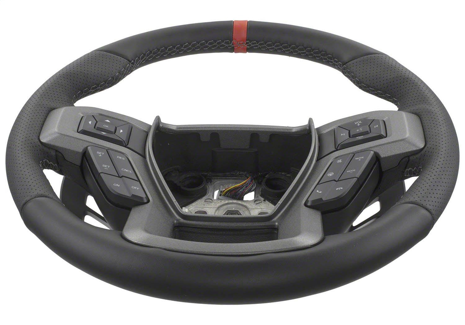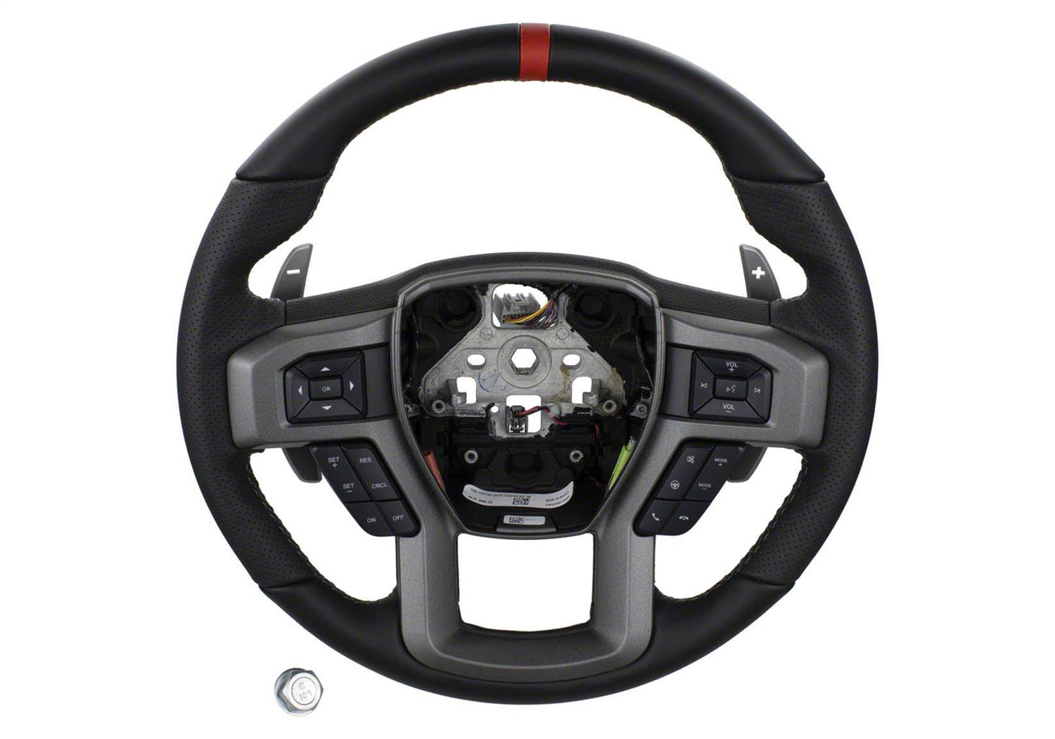 Black leather construction with perforated sides, grey stitching and a red leather sightline. The Raptor steering wheel has a more aggressive look and a defined feel then F-150 steering wheels. Steering wheel comes equipped with a wire harness, trim bezel and Raptor steering wheel control controls. Installation into a non-Raptor F-150 and Raptors equipped with the Technology Package (68R) requires the steering wheel controls to be swapped from the original steering wheel. Kit includes a 2017 Raptor red sightline heated steering wheel and all needed installation hardware.