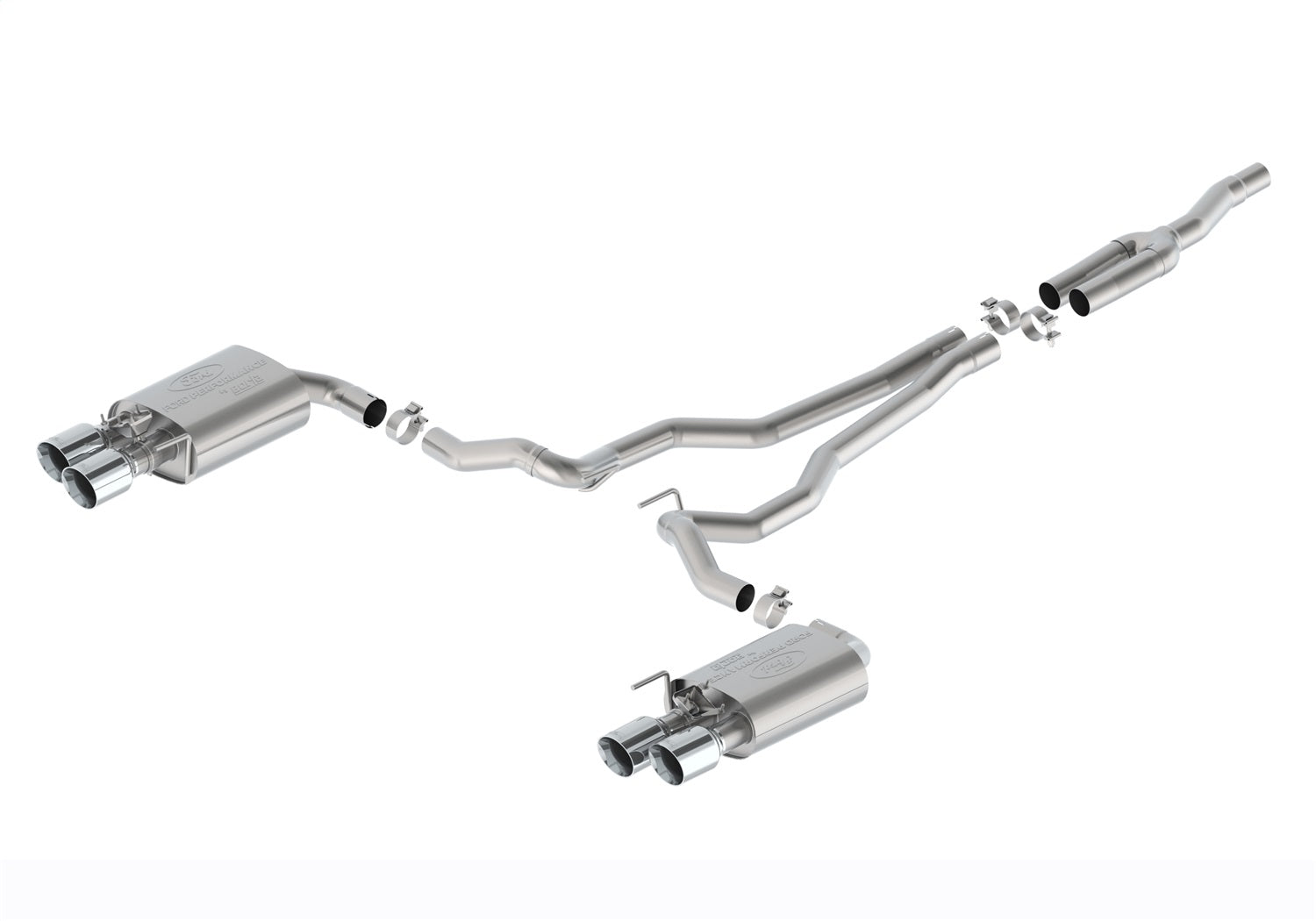 Ford Racing has partnered with industry leader Borla(R) Exhaust to offer the first in a series of Ford Racing by Borla(R) systems for the new 2015 Mustang. This cat-back system is constructed from ultra-smooth mandrel bent 300-series stainless steel tubing that is designed and fit to Ford Racing specs. This 2.5 in. cat-back exhaust system will give you an aggressive muscle car sound. This cat-back exhaust system with integral X-pipe bolts directly to the stock factory catalytic converters, making your Mustang 100% emission compliant. These tuned stainless steel mufflers with 4 in. chrome-plated stainless steel tips not only sound great but look great too.