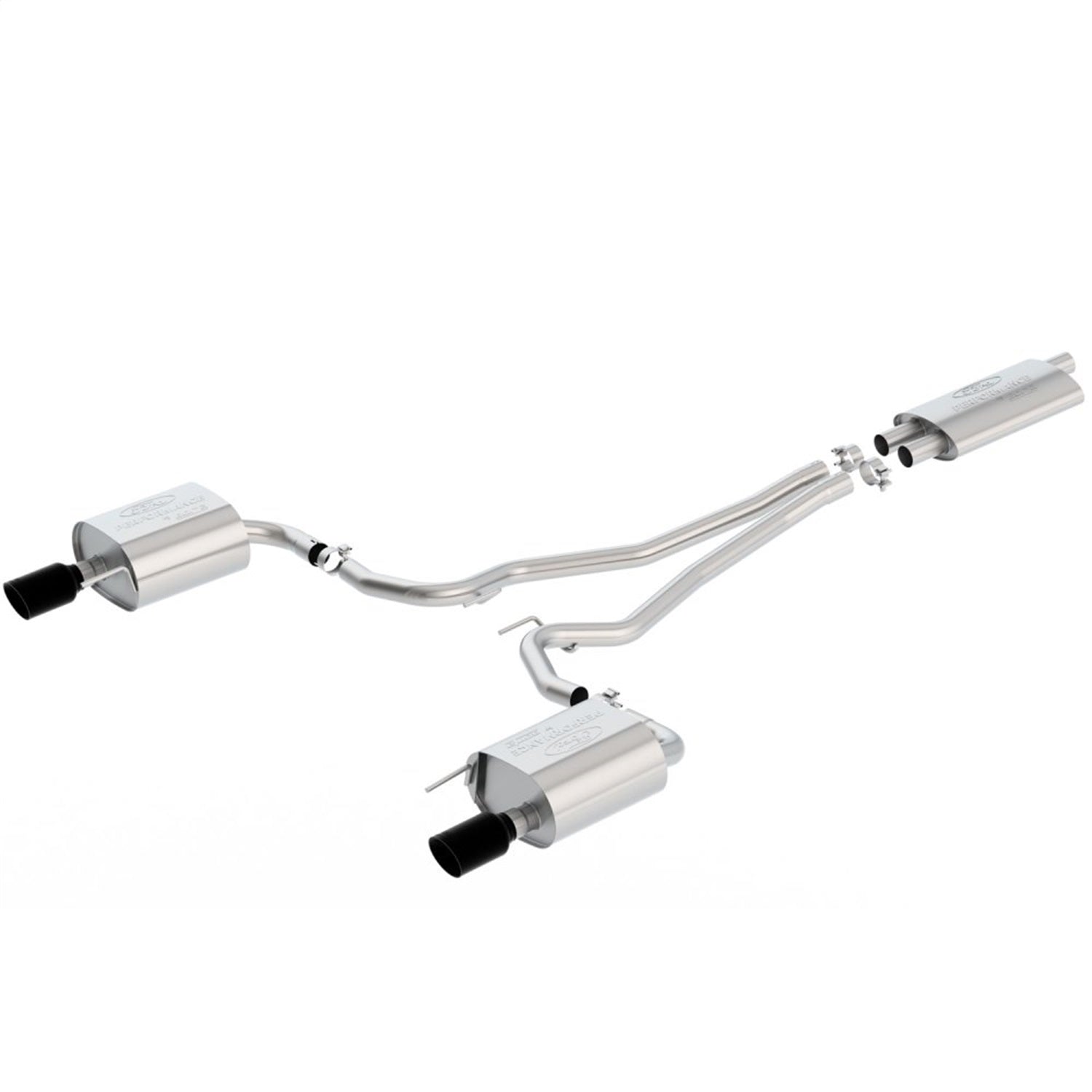 Ford Racing has partnered with industry leader Borla(R) Exhaust to offer the first in a series of Ford Racing by Borla(R) systems for the new 2015 Mustang. This cat-back system is constructed from ultra-smooth mandrel bent 300-series stainless steel tubing that is designed and fit to Ford Racing specs. This 2.5 in. cat-back exhaust system will give you an aggressive muscle car sound. This cat-back exhaust system with integral X-pipe bolts directly to the stock factory catalytic converters, making your Mustang 100% emission compliant. These tuned stainless steel mufflers with 4 in. chrome-plated stainless steel tips not only sound great but look great too.