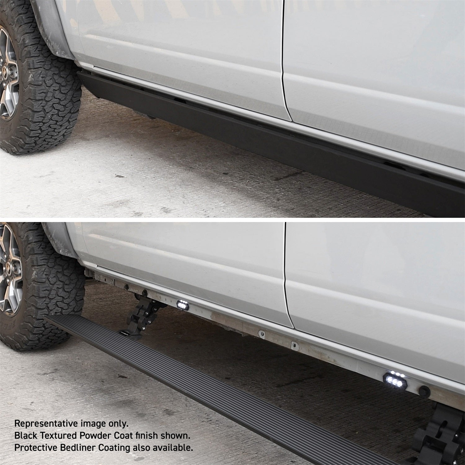 RealTruck VoltStep Electric Running Boards allow you to step in and out of your truck, Jeep, Bronco or SUV with ease. Open your door and the VoltStep automatically deploys, providing a secure 6 in. wide durable aluminum running board with an anti-slip surface. For additional safety and security, the integrated LED lights turn on automatically when the board deploys. Close your door and VoltStep automatically retracts, providing your vehicle with optimal ground clearance and protection for its rocker panel while preserving the look of your vehicle. With dual motors on each board, Go Rhino's electric running boards are reliable even in extreme climates. The easy-to-install, magnetically activated door switches leave your OBD port free for other accessories. Automatic safety stop and manual override capabilities are included. Boards are finished with a Textured Black Powder Coat and have black nylon endcaps. The VoltStep Electric Running Board Kits come with a Limited Lifetime warranty on materials and construction and a 5-year warranty on the Textured Black finish.