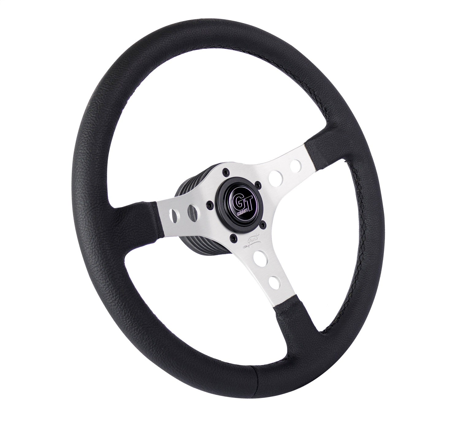 Formula GT Steering Wheel; 15 in. Diameter; 3 in. Dish; Black Vinyl Hand Grip; Silver Satin Anodized 3-Spoke Design;