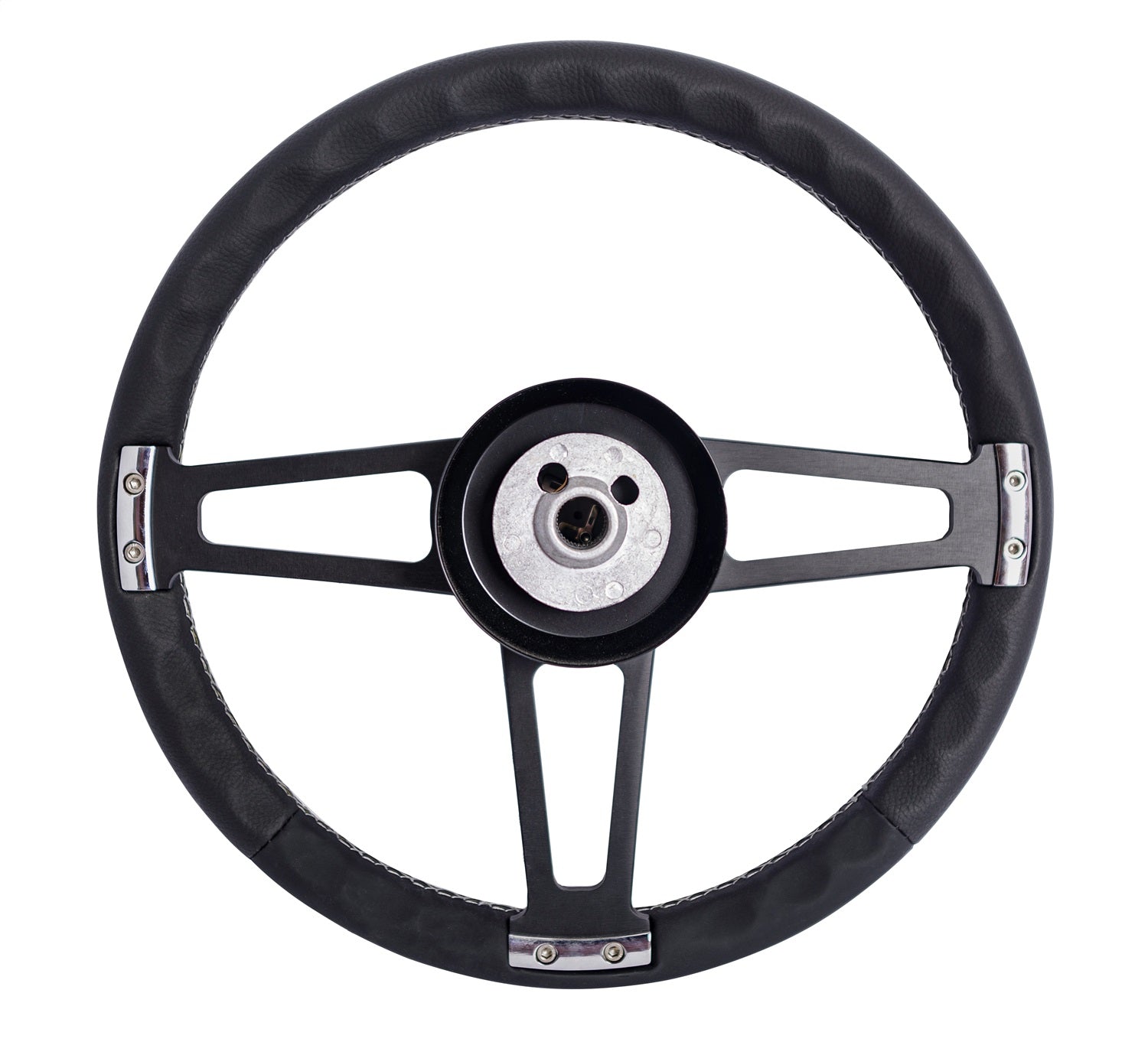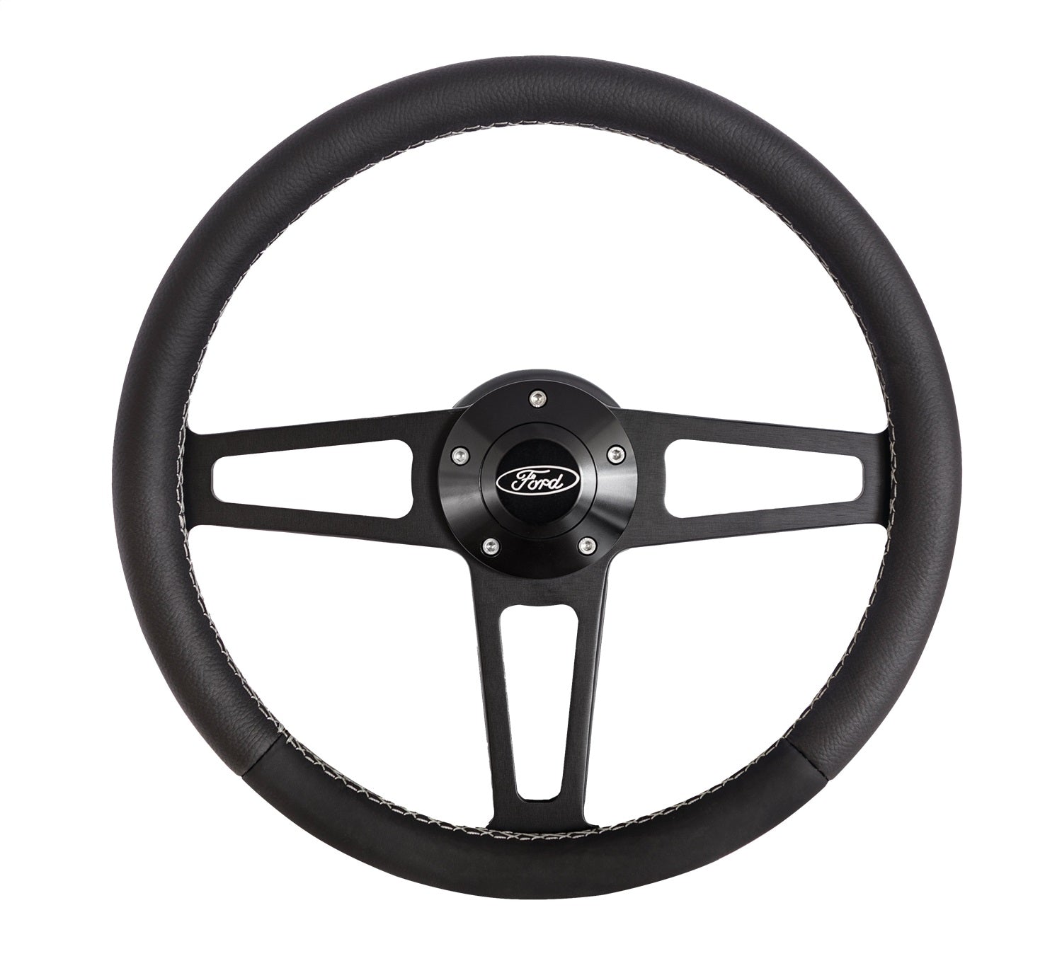 Steering Wheel - T Series - 13.75 in Diameter - Flat - 3-Spoke - Black Leather Grip - Ford Oval Logo - Aluminum - Black Anodized - Ford Fullsize SUV / Truck / Van 1965-77 - Each