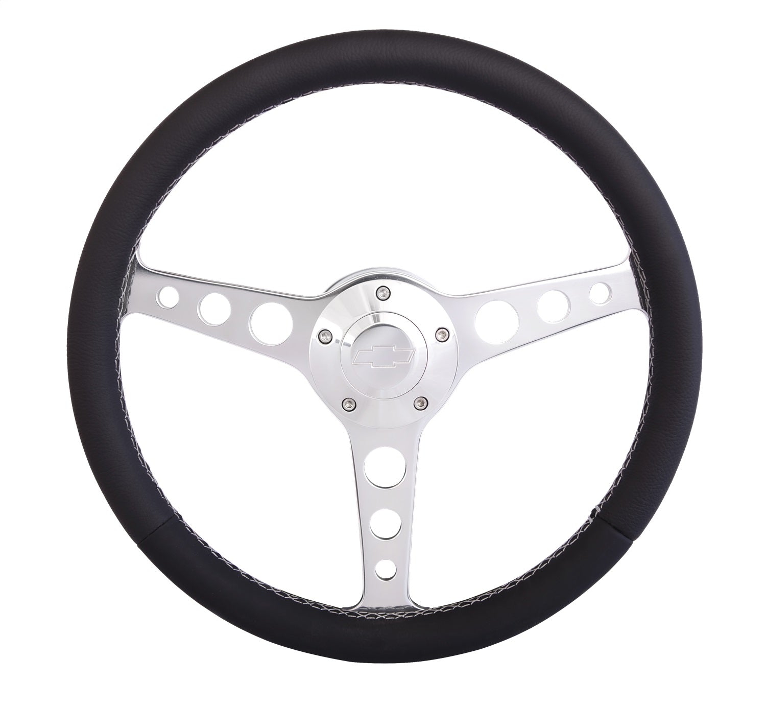 Steering Wheel - Classic Series - 13.75 in Diameter - Flat - 3-Spoke - Black Leather Grip - Chevrolet Bowtie Logo - Aluminum - Polished - GM Fullsize SUV / Truck / Van / GM Compact SUV / Truck / Van 1974-94 - Each