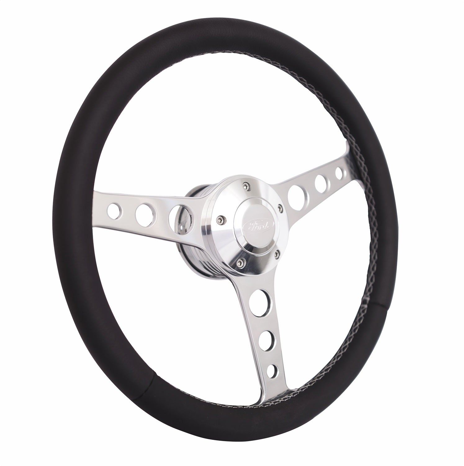 Steering Wheel - Classic Series - 13.75 in Diameter - Flat - 3-Spoke - Black Leather Grip - Ford Oval Logo - Aluminum - Polished - Ford 1964-77 - Each