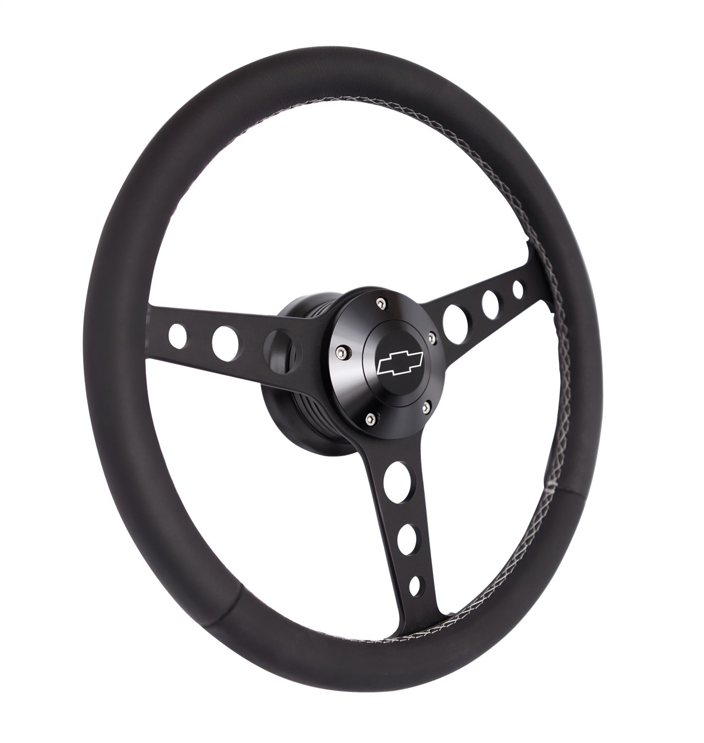 Steering Wheel - Classic Series - 13.75 in Diameter - Flat - 3-Spoke - Black Leather Grip - Chevrolet Bowtie Logo - Aluminum - Black Anodized - GM Fullsize SUV / Truck / Van 1970-75 - Each