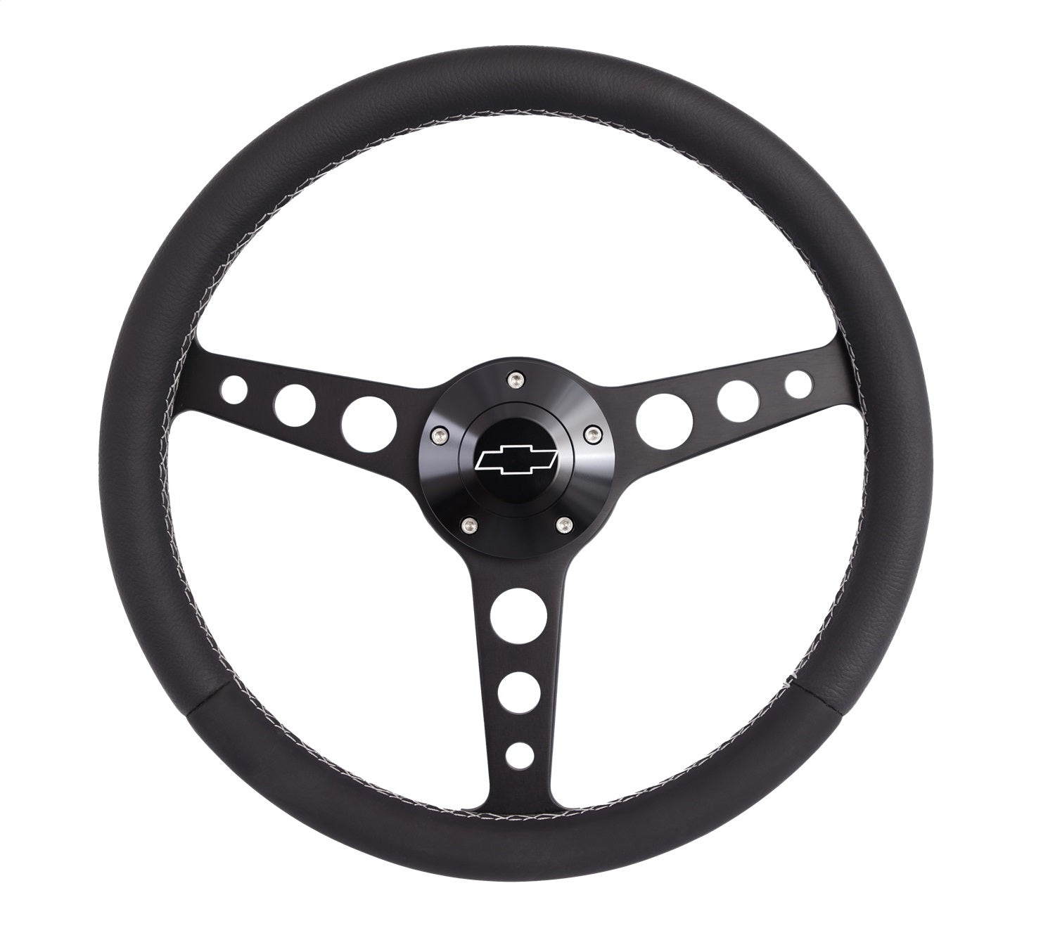 Steering Wheel - Classic Series - 13.75 in Diameter - Flat - 3-Spoke - Black Leather Grip - Chevrolet Bowtie Logo - Aluminum - Black Anodized - GM Fullsize SUV / Truck / Van / GM Compact SUV / Truck / Van 1974-94 - Each
