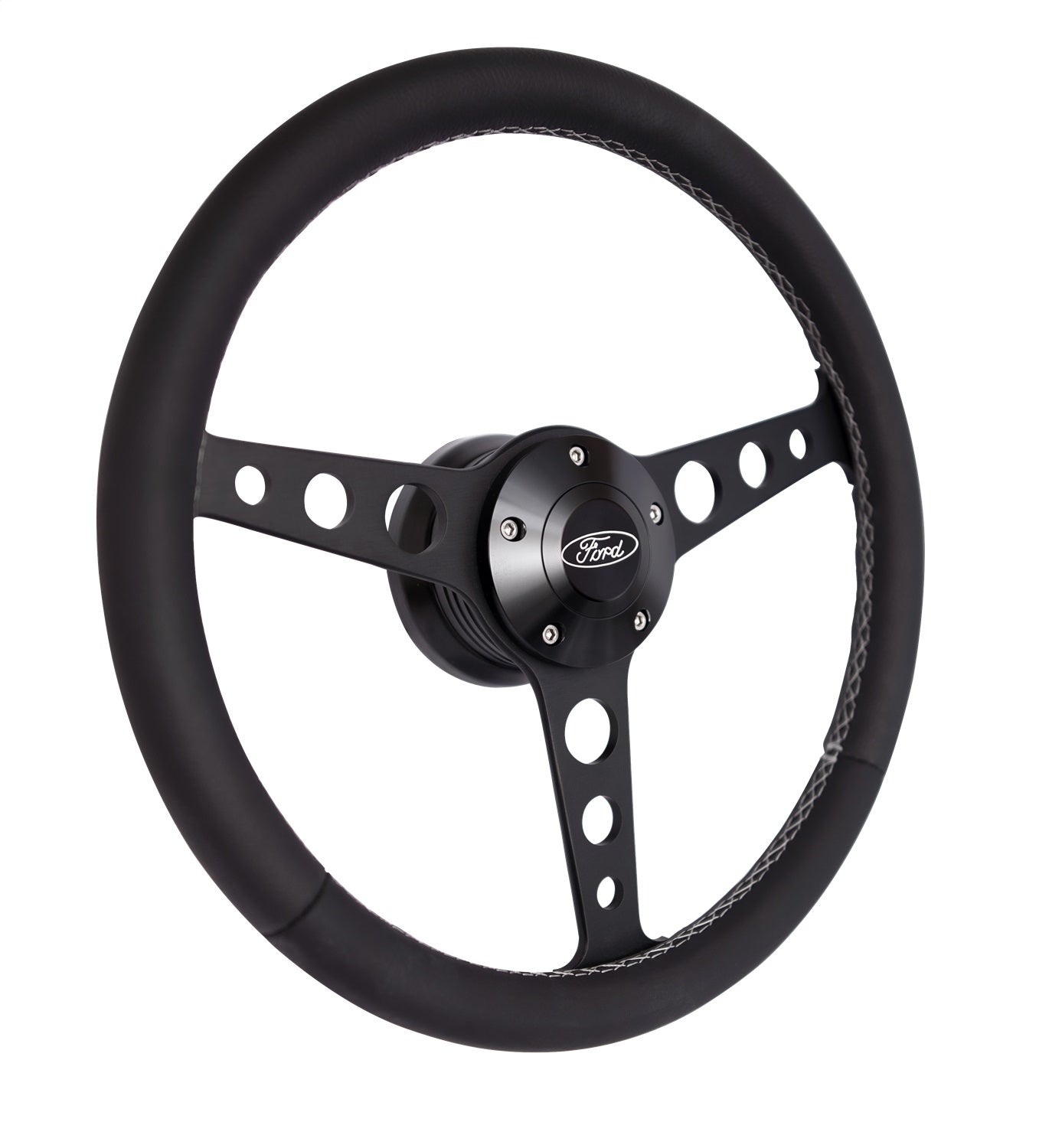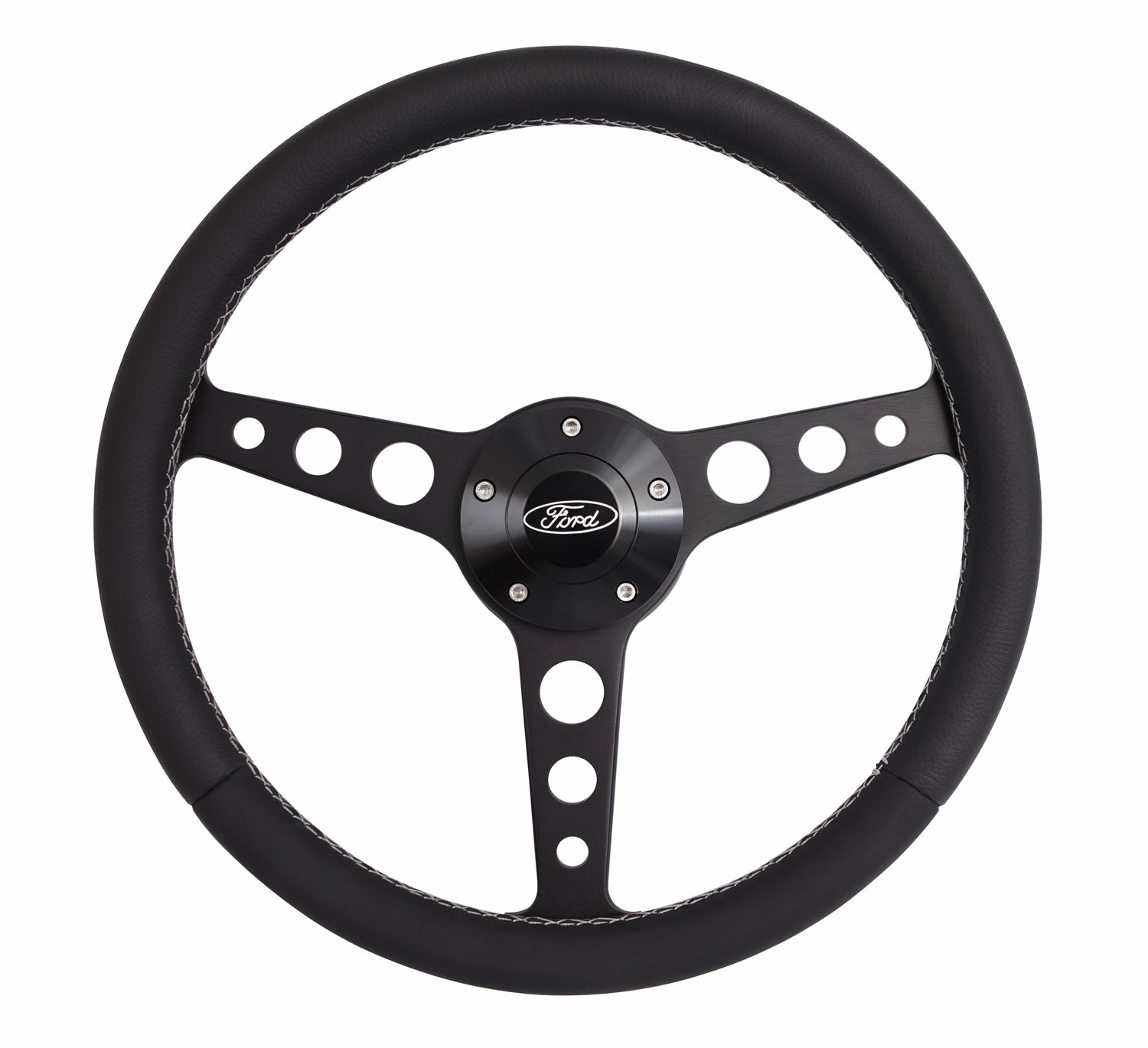 Steering Wheel - Classic Series - 13.75 in Diameter - Flat - 3-Spoke - Black Leather Grip - Ford Oval Logo - Aluminum - Black Anodized - Ford 1969-91 - Each