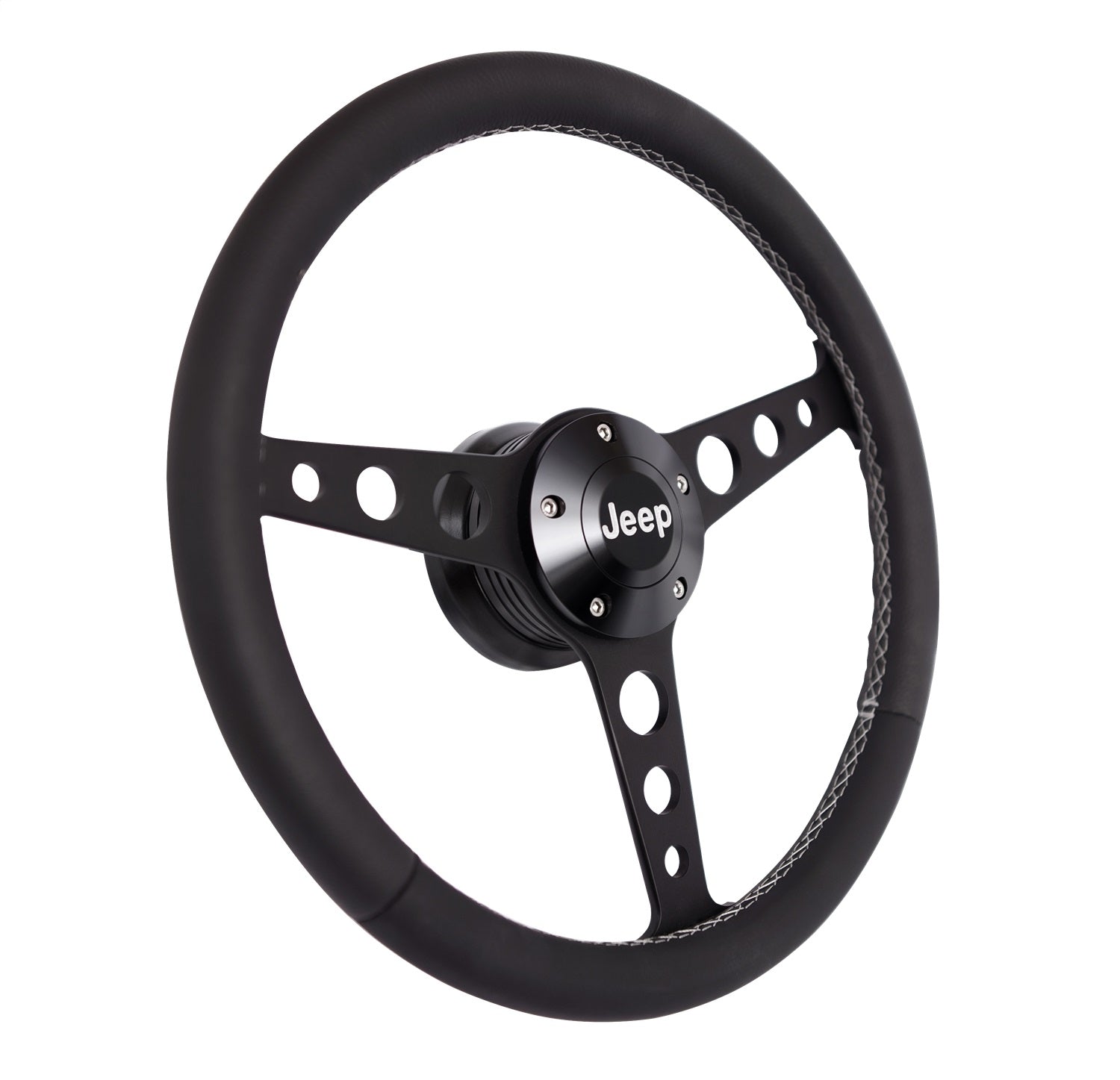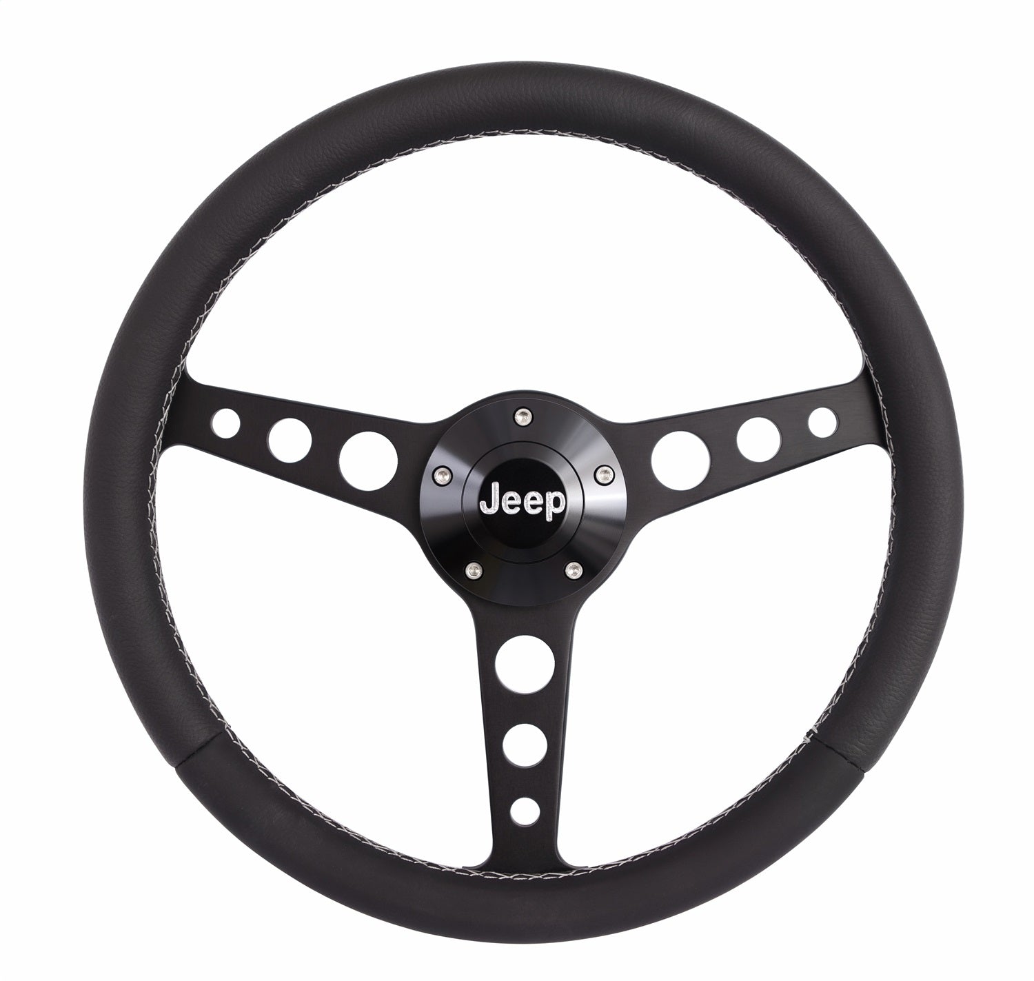 Steering Wheel - Classic Series - 13.75 in Diameter - Flat - 3-Spoke - Black Leather Grip - Jeep Logo - Aluminum - Black Anodized - Jeep 1974-95 - Each