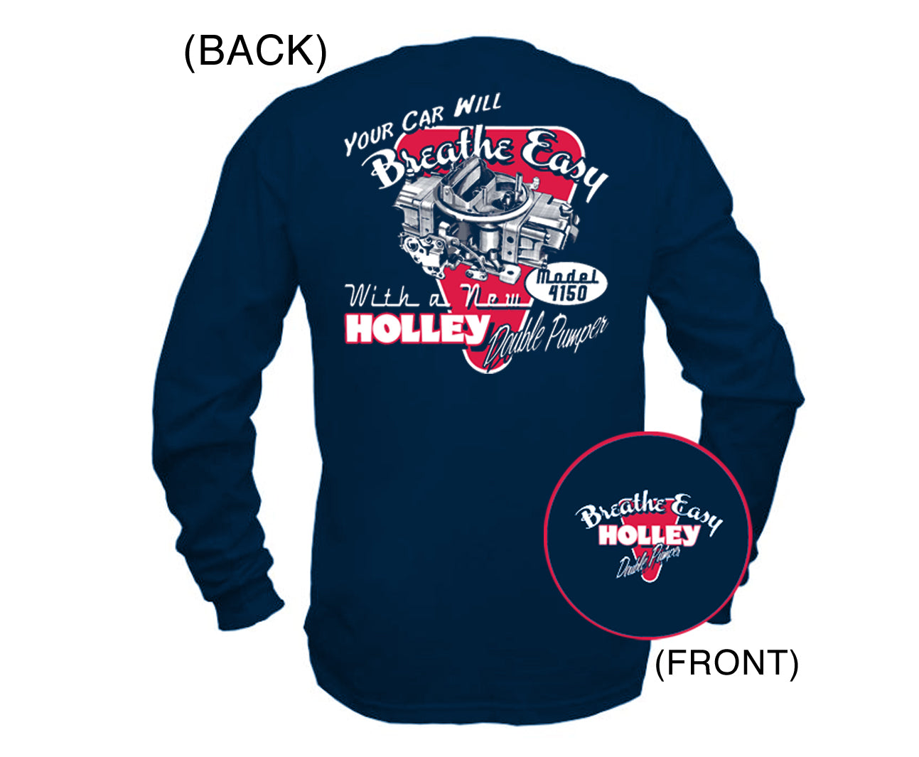 World Famous! There are carburetors and then there is a Holley carburetor. And, none is more famous than the formidable Holley Double Pumper(R). The Double Pumper met the demands for increased power being delivered by the factory muscle cars of the 1960s and is still doing so today! The new "Breathe Easy" t-shirt conjures images of this golden era of performance. The red and grey art contrasts perfectly against the navy blue comfy tee. Put one on and "Breathe Easy" knowing the statement on your back says youre a true hot rodder. This long sleeve shirt comes in SMALL TO 3X.
