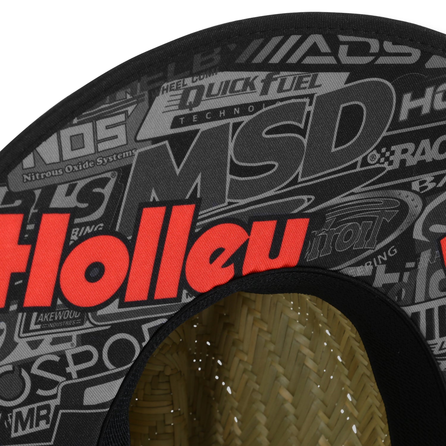 Holley Straw Hat - Protect your head and face from the sun while cruising around in your Hot Rod or enjoying an event. This hat features the Holley logo on the front and "sticker bomb" graphics on the underside. This "sticker bomb" design is designed to mimic the popular past time of plastering stickers all over a shop fridge or tool box.