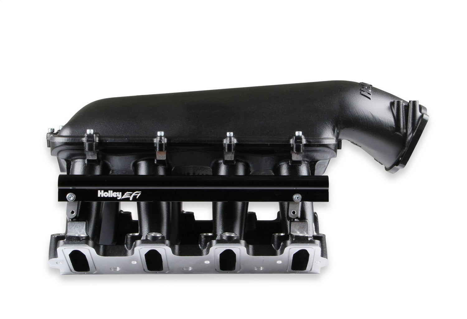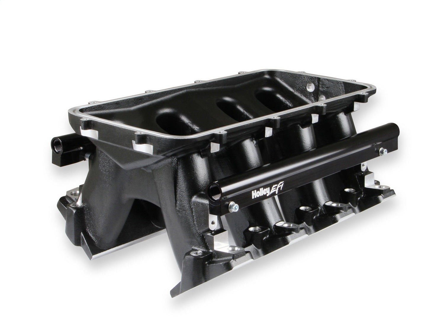 The Holley GM LS1/LS2/LS6 Modular Hi-Ram Intake Manifold is introduced as a cost effective alternative to fabricated sheet-metal for high-performance applications where induction system height is not limited. Coupling this Hi-Ram intake with the high flowing LS1/LS2/LS6 style cylinder heads has outstanding potential for N/A and forced induction applications at a budget-minded cost. Aggressive, bold, race-bred styling will make bad intentions clear for drag race, muscle car, marine, off-road, sandrails, pulling trucks, track, street-rod applications and more! The base is designed to be modular in configuration to accept a wide range of carbureted and EFI tops and to be attractive to builders and fabricators as the foundation for custom induction systems. Runner length and the tapered cross-section designed to perform well for a wide range of engine configurationsEFI fuel rails are machined for -8AN O-ring Fittings with passages large enough to accommodate high fuel flows and dampen pressure pulsations in the fuel system and come standard with EFI Hi-Ram kits. Cast aluminum construction. Intended for use on N/A or forced induction engines in the 6.0 to 7.0+ liter range, max power at 7000-8000+RPM.