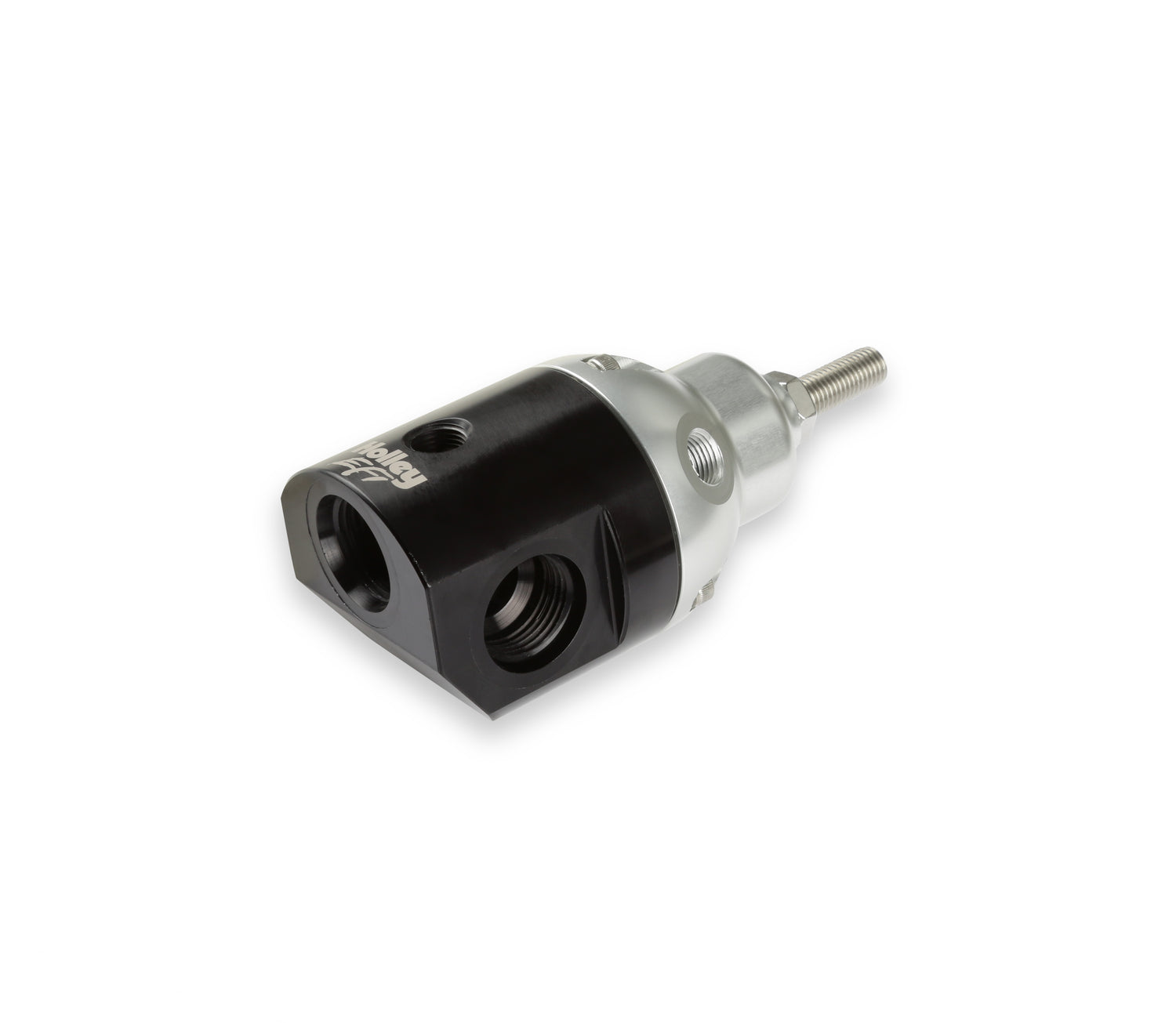 Holley EFI universal bypass fuel pressure regulators are for use with fuel systems in street or track applications. They feature adjustable base pressure from 15-90 psi, a gauge port, and a boost reference port as well. The regulators are ideal for vehicles/systems where superior flow and pressure control are desired. The regulators are precision machined from 6061-T6 billet aluminum for strength and durability. They feature a black bright dip anodized body and a clear bright dip anodized top for corrosion resistance and good looks. The Holley 12-894 has -6AN port sizes and the 12-895 has -8AN port sizes.